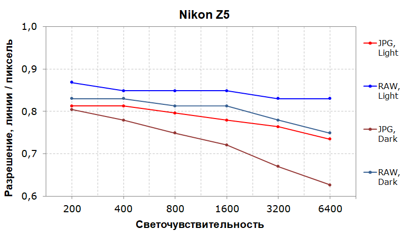 RAW в светлой сцене выдает хорошую разрешающую способность на уровне 85% вплоть до ISO 6400. В темной сцене в RAW разрешение держится на уровне 82% до ISO 1600, и падает ниже 80% после. JPEG в обеих сценах выдает разрешение в среднем на 10% ниже, чем RAW и держится выше 80% лишь на низких значениях светочувствительности. В целом, показатели достаточно высокие, особенно, стабильность RAW.