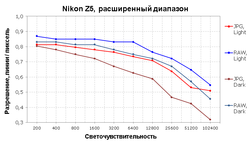 В расширенном диапазоне светочувствительности RAW и JPEG на ISO 12800 выдают более 70%, что является неплохим результатом, не считая JPEG темной сцены, который уже на ISO 6400 падает ниже 70%, а на ISO 12800 — ниже 60%.