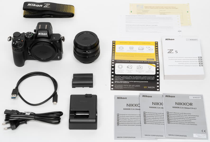 В комплект поставки помимо самой камеры входят объектив Nikkor Z 24-50mm F4-6.3, шейный ремень, одна батарея, зарядное устройство и кабель USB 3 с разъемом Type-C.