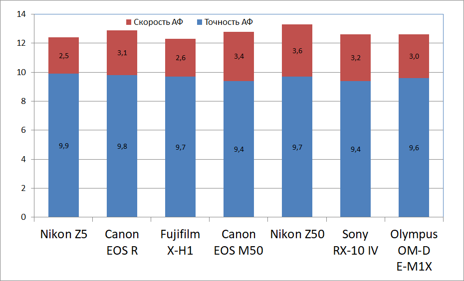 В общем зачете по скорости АФ камера находится далеко не на первом месте нашего рейтинга, даже ниже Nikon Z50. Зато по точности Nikon Z5 обгоняет все ранее протестированные камеры, что, вероятно, объясняет не самую высокую скорость фокусировки, примерно на уровне Fujifilm X-H1. В общем, новинка хороша для неспешной съемки.