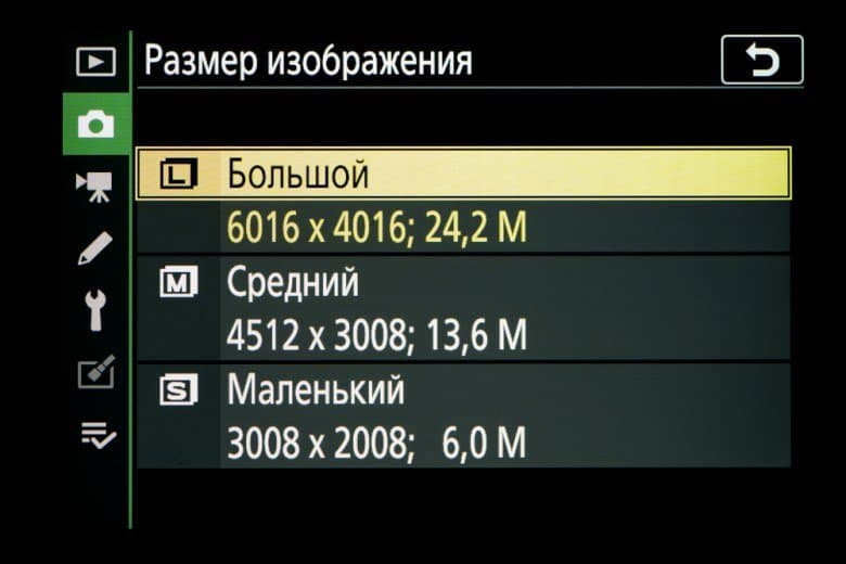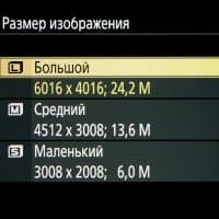 | Разрешение фотоснимков | FX (36×24 мм): 6016×4016, 4512×3008, 3008×2008; DX (24×16 мм): 3936×2624, 2944×1968, 1968×1312; 1:1 (24×24 мм): 4016×4016, 3008×3008, 2000×2000; 16:9 (36×20 мм): 6016×3384, 4512×2536, 3008×1688 |