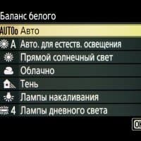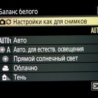 | Баланс белого | авто (3 типа), авто для естественного освещения, прямой солнечный свет, облачно, тень, лампы накаливания, лампы дневного света (7 типов), вспышка, прямая установка цветовой температуры (2500—10000 К), пользовательский (до 6 значений) |