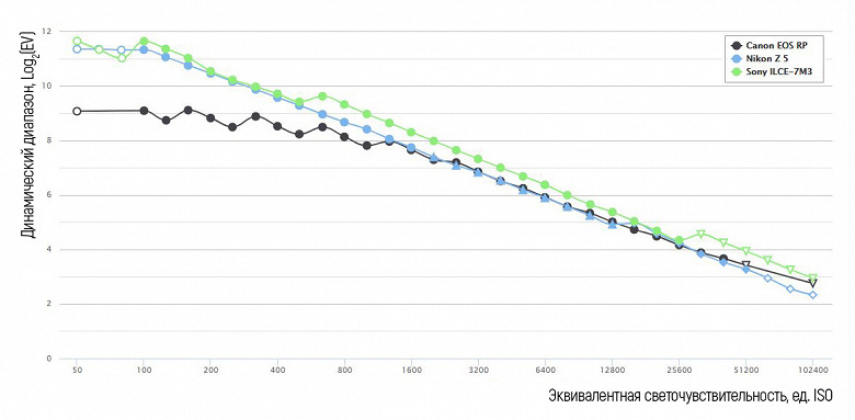 Бесспорным лидером является конкурент от Sony, а Nikon Z5 по показателю ДД занимает промежуточное положение. Canon EOS RP примерно соответствует Nikon Z5 при ISO 1200—12800, но при низких и умеренных значениях эквивалентной светочувствительности (ISO 50—800) заметно проигрывает остальным участникам соревнования.
