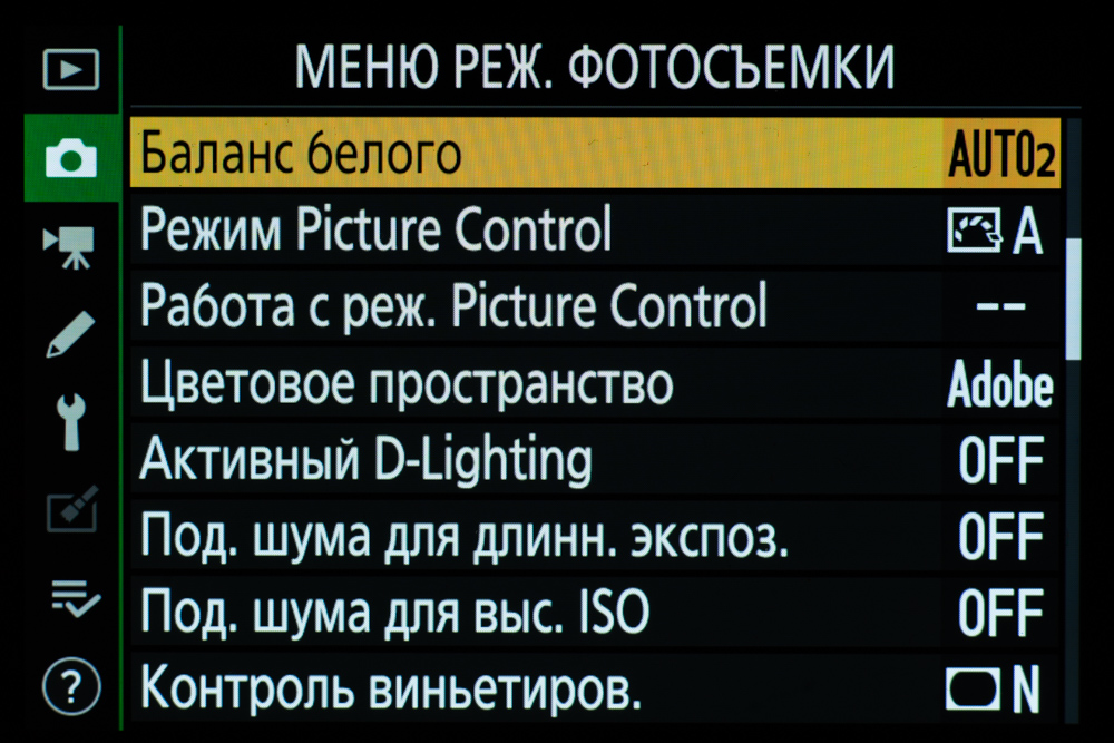 | Эффекты изображения (Picture Control) | Цветность: авто, стандарт, нейтраль, насыщенный, монохром, портрет, пейзаж, равномерный; Творческие режимы: сон, утро, популярный, воскресенье, мрачность, драма, тишина, выбеливание, меланхолия, чистота, деним, игрушка, сепия, синий, красный, розовый, уголь, графит, сажа |