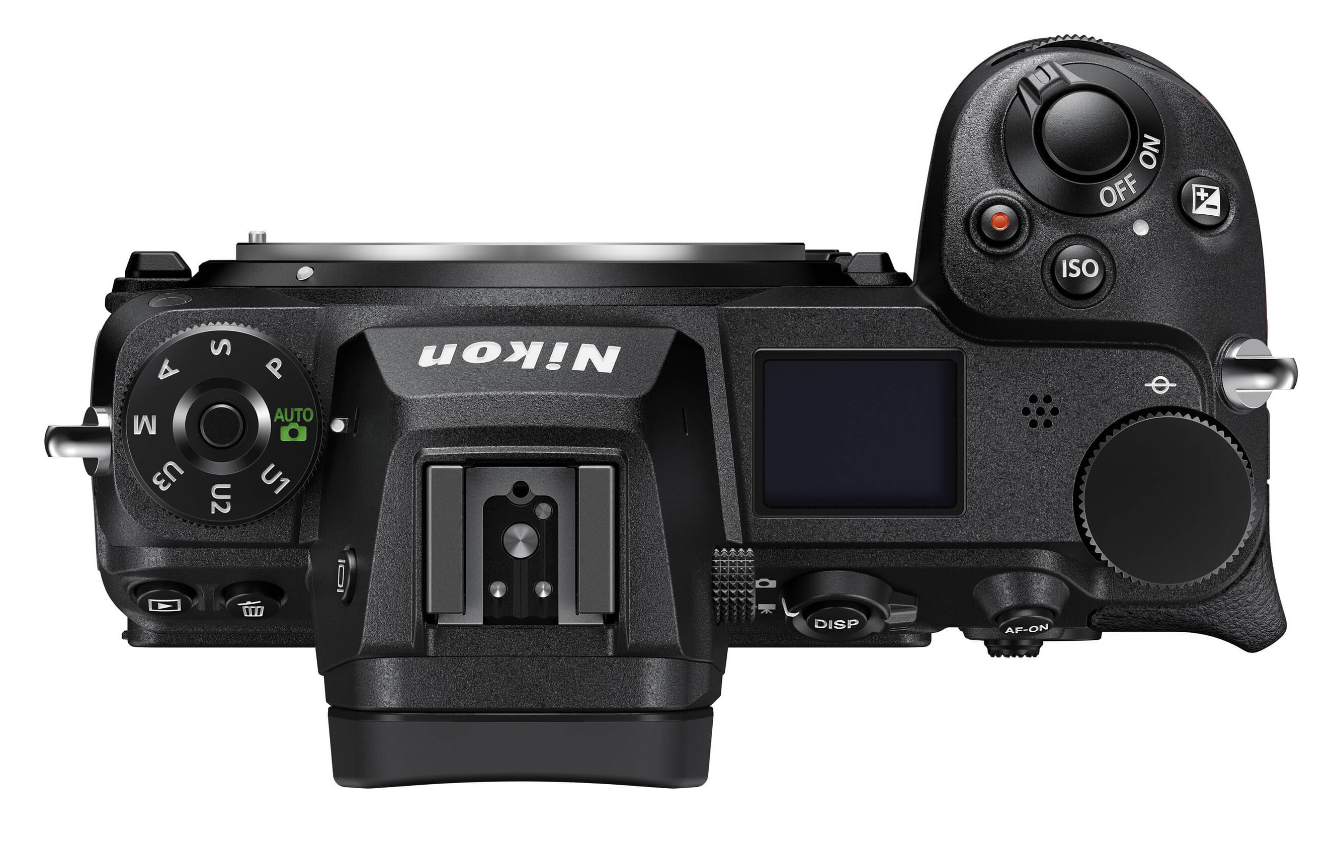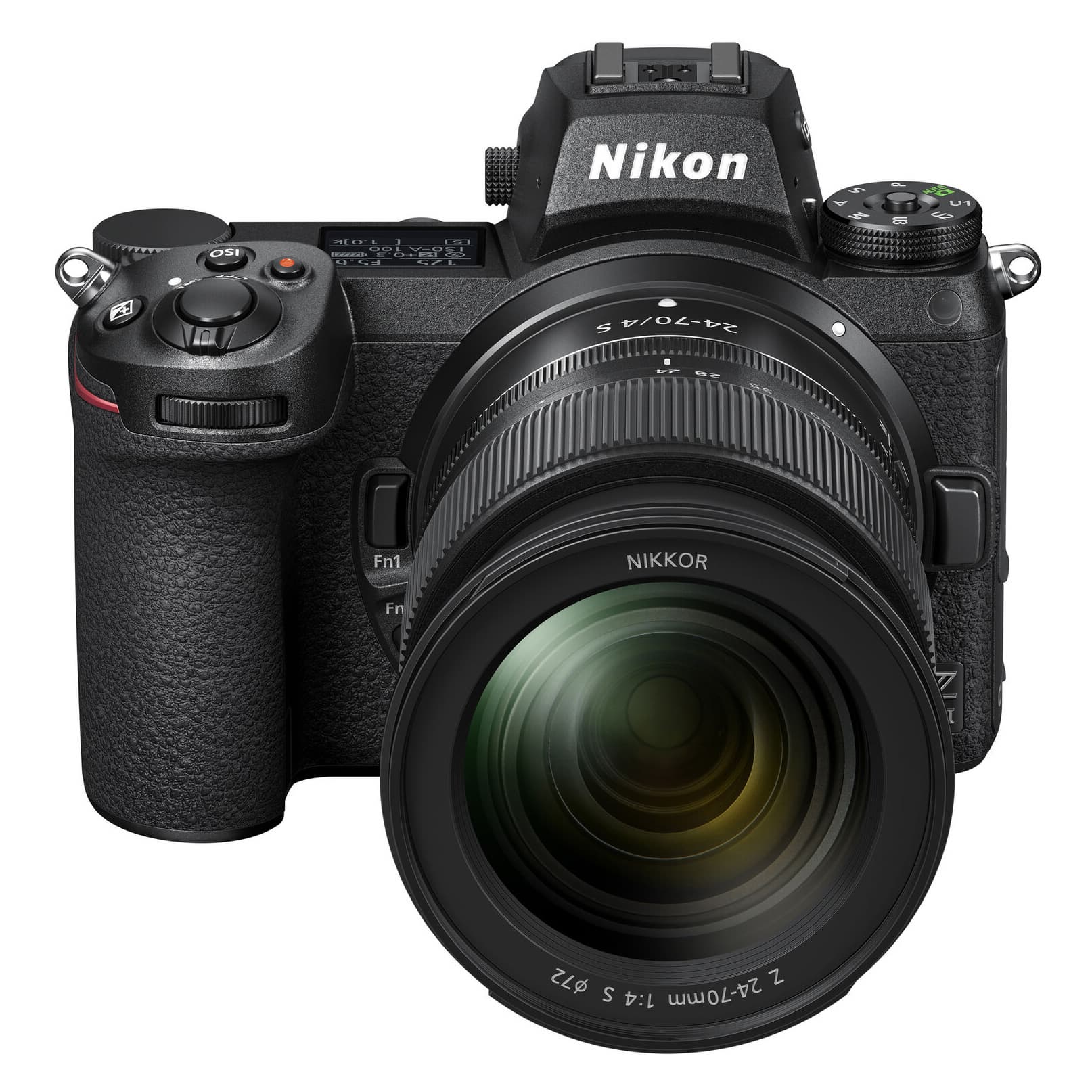 При взгляде анфас вокруг кольца байонета обнаруживаются традиционные для производителя детали: клавиша разблокировки объектива (на трех часах) и две функциональные кнопки Fn1 и Fn2. В верхнем правом углу расположен прожектор подсветки автофокуса (АФ), в верхнем левом — переднее колесо установки параметров съемки и кнопка спуска затвора с обнимающим ее рычажком выключателя питания.
