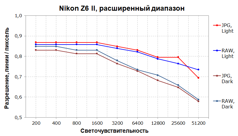 В расширенном диапазоне светочувствительности RAW и JPEG на ISO 12800 выдают около 80% в светлой сцене и около 70% в темной, что является неплохим результатом. В светлой сцене разрешение не падает ниже 70% даже на ISO 51200.
