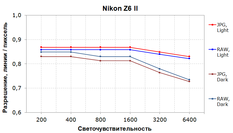 В обеих сценах RAW и JPG практически не отличаются, что говорит о хорошей внутрикамерной обработке. В светлой сцене разрешение стабильно держится на уровне 85% вплоть до ISO 6400. В темной сцене падает буквально на пару процентов в диапазоне до ISO 1600, затем опускается ниже 80%. В целом, показатели достаточно высокие и стабильные.
