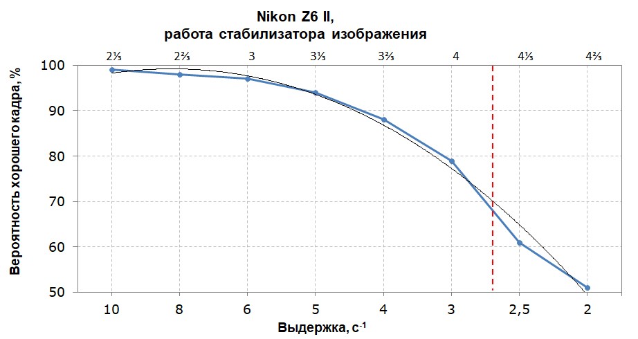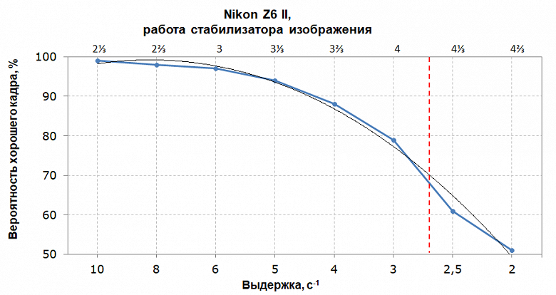 На русскоязычном сайте производитель не указывает эффективность стабилизатора, а на англоязычном ресурсе imaging.nikon.com приведено значение в 5 ступеней экспозиции. Наша методика позволяет оценить эффективность стабилизатора примерно в 4 ступени экспозиции с выходом годных 70% — это хороший результат.