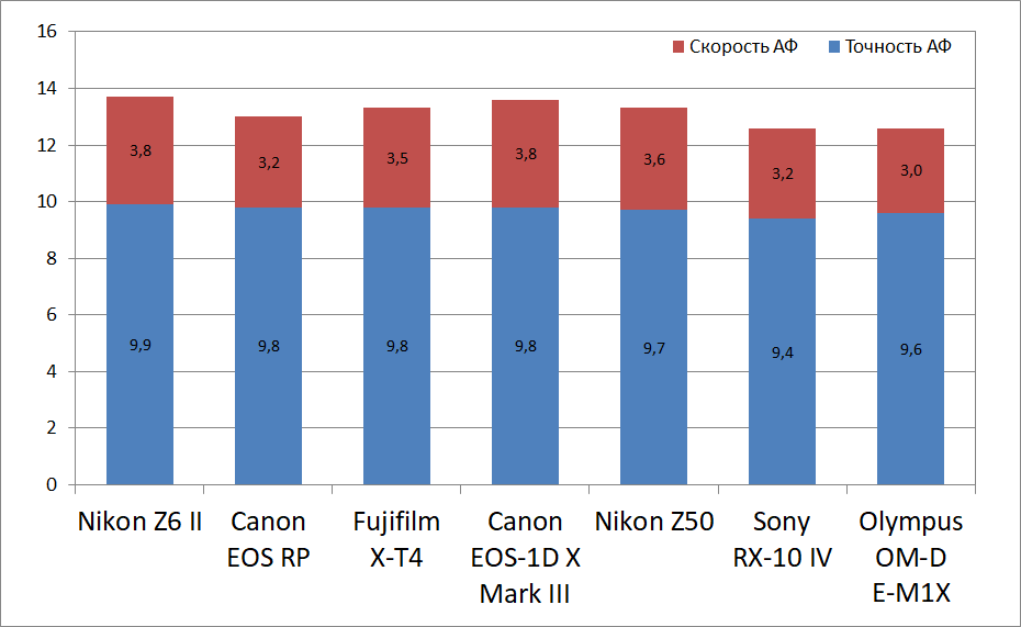 На данный момент Nikon Z6 II лидирует в нашем рейтинге. По точности она практически идеальна, что уже давно стало нормой для топовых камер, а по скорости обгоняет все ранее протестированные камеры, кроме Canon 1D X Mark III. Даже по сравнению с предыдущей моделью новинка заметно подросла.