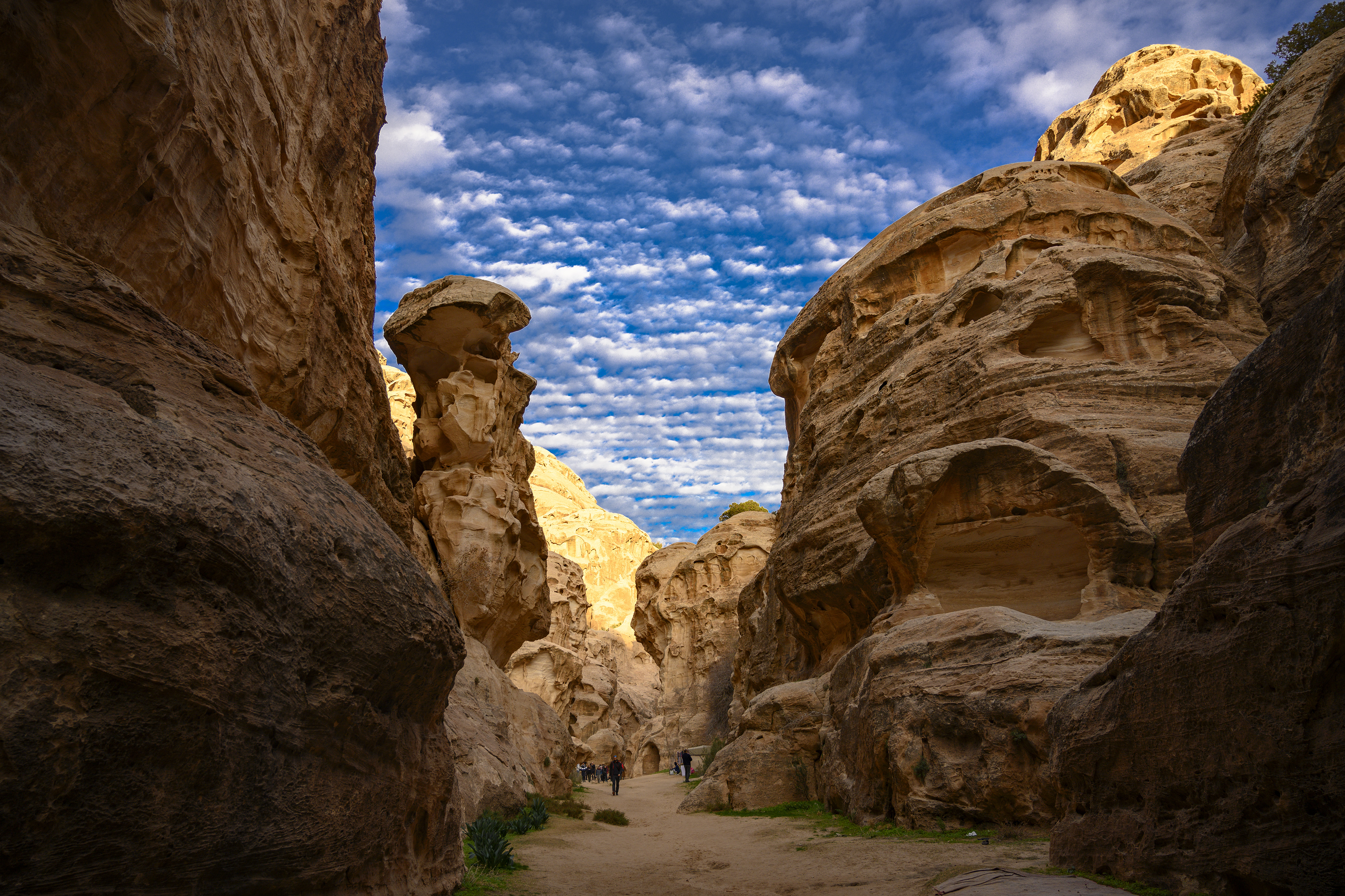 Малая Петра — памятное место Моисеевой долины, расположенное к северу от входа в Большую. Арабы придумали ему название «Сик Эль-Барид» — холодное ущелье, — и действительно, весной и летом тут не так жарко, как в Большой Петре, а туристов значительно меньше, поскольку организованные группы приезжают сюда нечасто, а большинство «дикарей» не пользуются арендой автомобилей, и для них 10-километровый путь из Вади-Мусы несколько затруднен. Посещение бесплатное. Официально сайт закрывается в зимний период в 16:30, но на самом деле тут можно гулять хоть до ночи, особенно если договориться с местными. Правда, после захода солнца (в день нашего посещения — в 16:50) тут сразу падает завеса тьмы, и ни зги не видно.