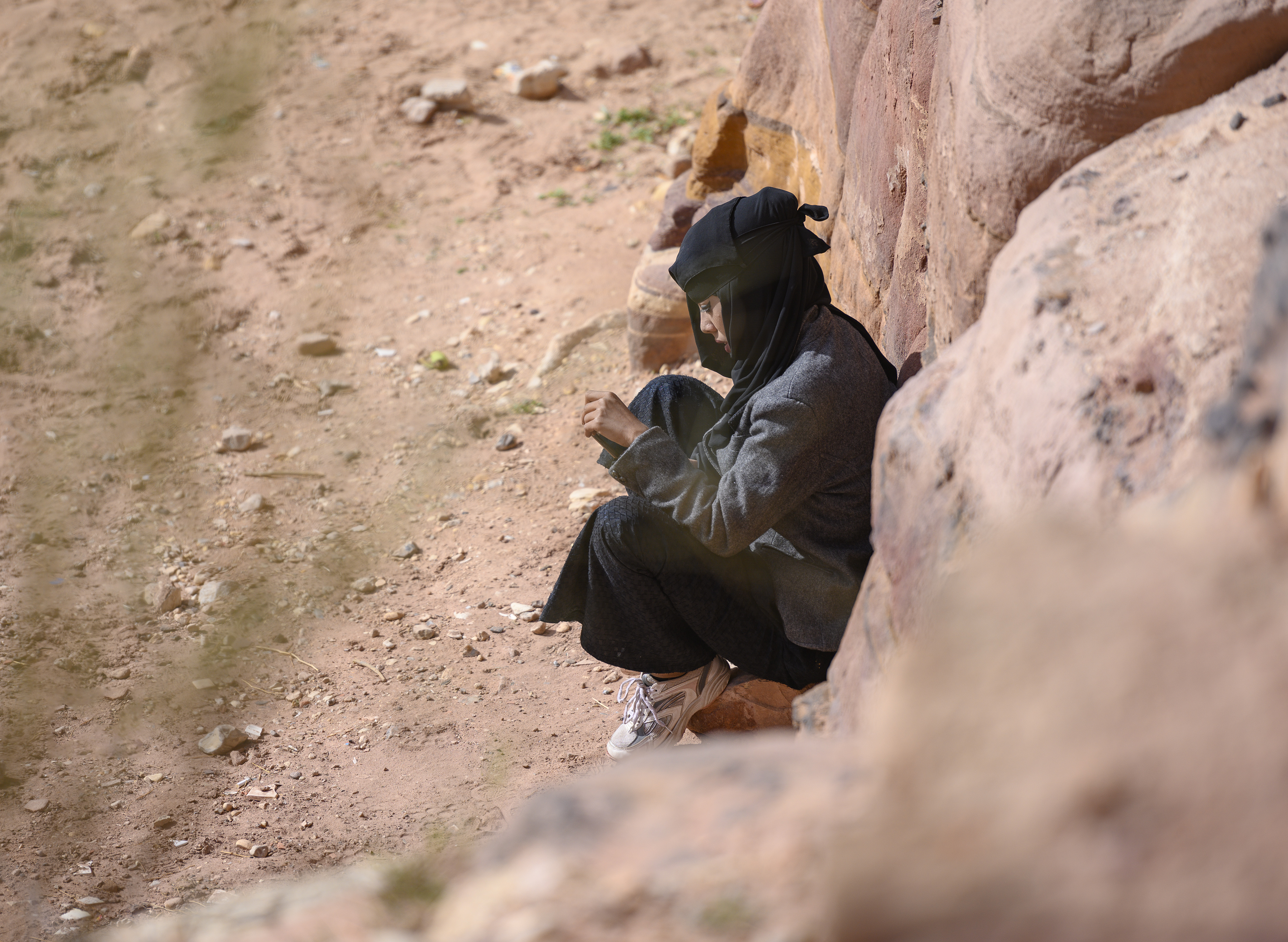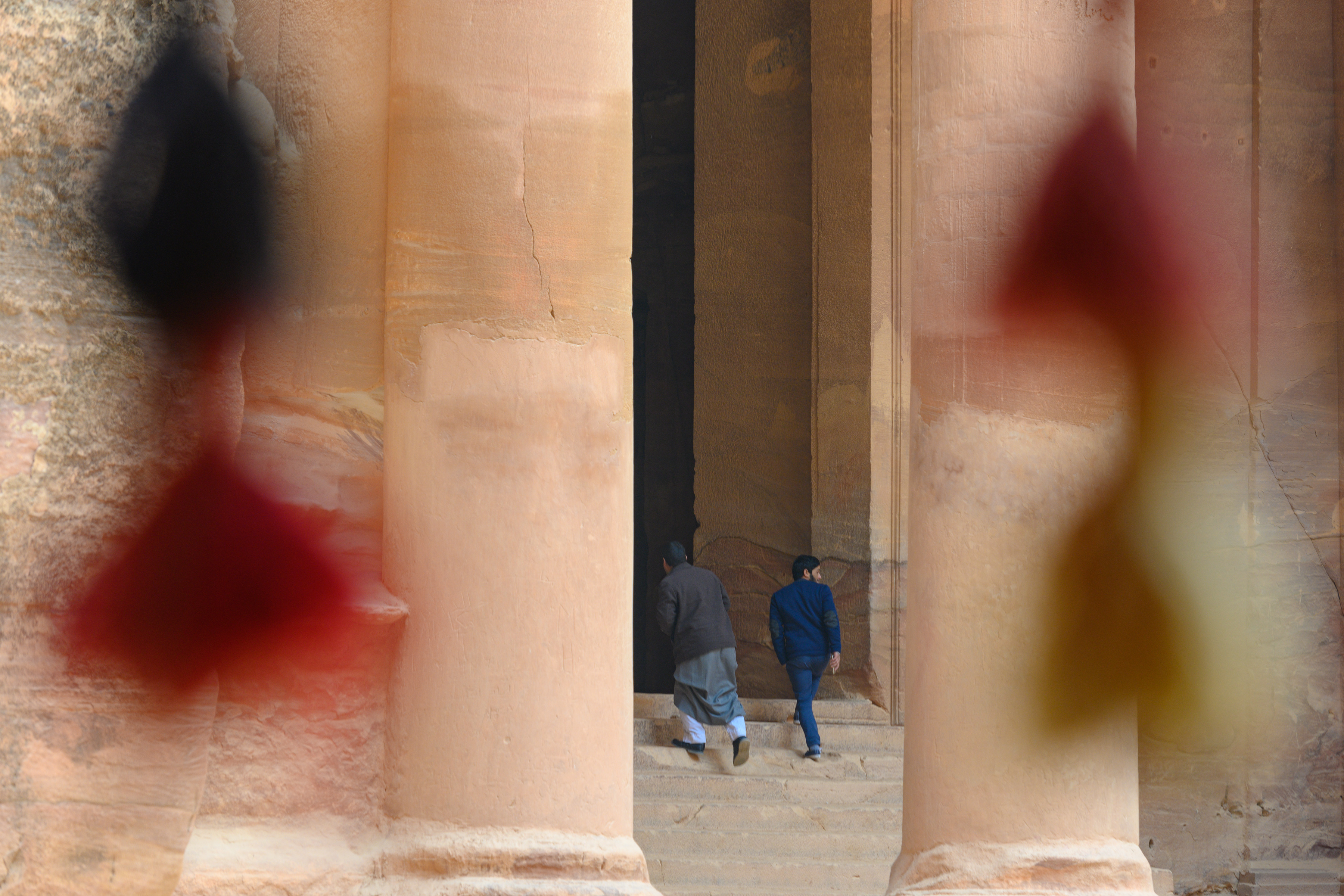 На обратном пути мы подходим к Набатейскому театру. Это единственный в мире античный театр, построенный не так, как все остальные: здесь никто не укладывал в землю отдельные каменные блоки, а все было высечено целиком из скальной породы. Внутрь театра никого не пускают, но для осмотра можно найти точку на возвышении. Здесь уже появилось много посетителей, и они, конечно, норовят помешать съемке, но я использую мешающих на благо композиции.