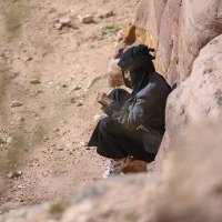 На вершине Эль-Хубты оборудован своего рода наблюдательный пост: на камнях разбросаны маты и ковры, а сверху натянут тент для защиты от осадков. Впрочем, тут все равно сидеть крайне неудобно, поскольку из-за особенностей рельефа поясница не находит опоры, и тело все время норовит завалиться на спину. Зато отсюда удается сделать самые необычные снимки.