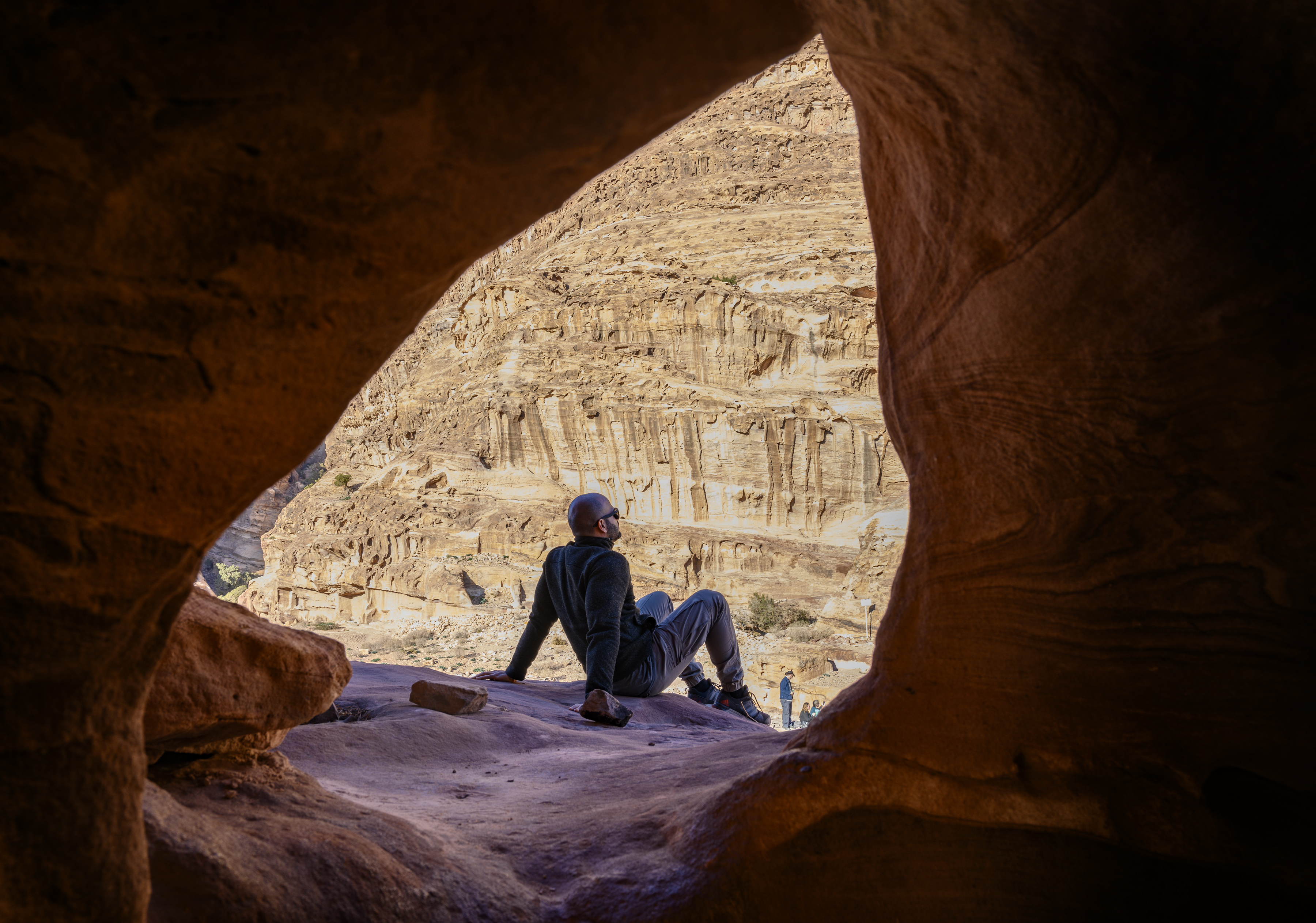 Перед входом в Малую Петру красуется древняя гробница — неведомо чья, неведомо кем и когда построенная, но очень живописная: классический набатейский фасад изящно обрамлен плавными формами скалы, в которой он высечен, низкое вечернее солнце удачно высвечивает плавные очертания нагромождений розового песчаника, а глубокие тени создают очень активный контраст. Я добавил к этой готовой картинке еще и края каменного козырька, нависающего над нишей в скале напротив.