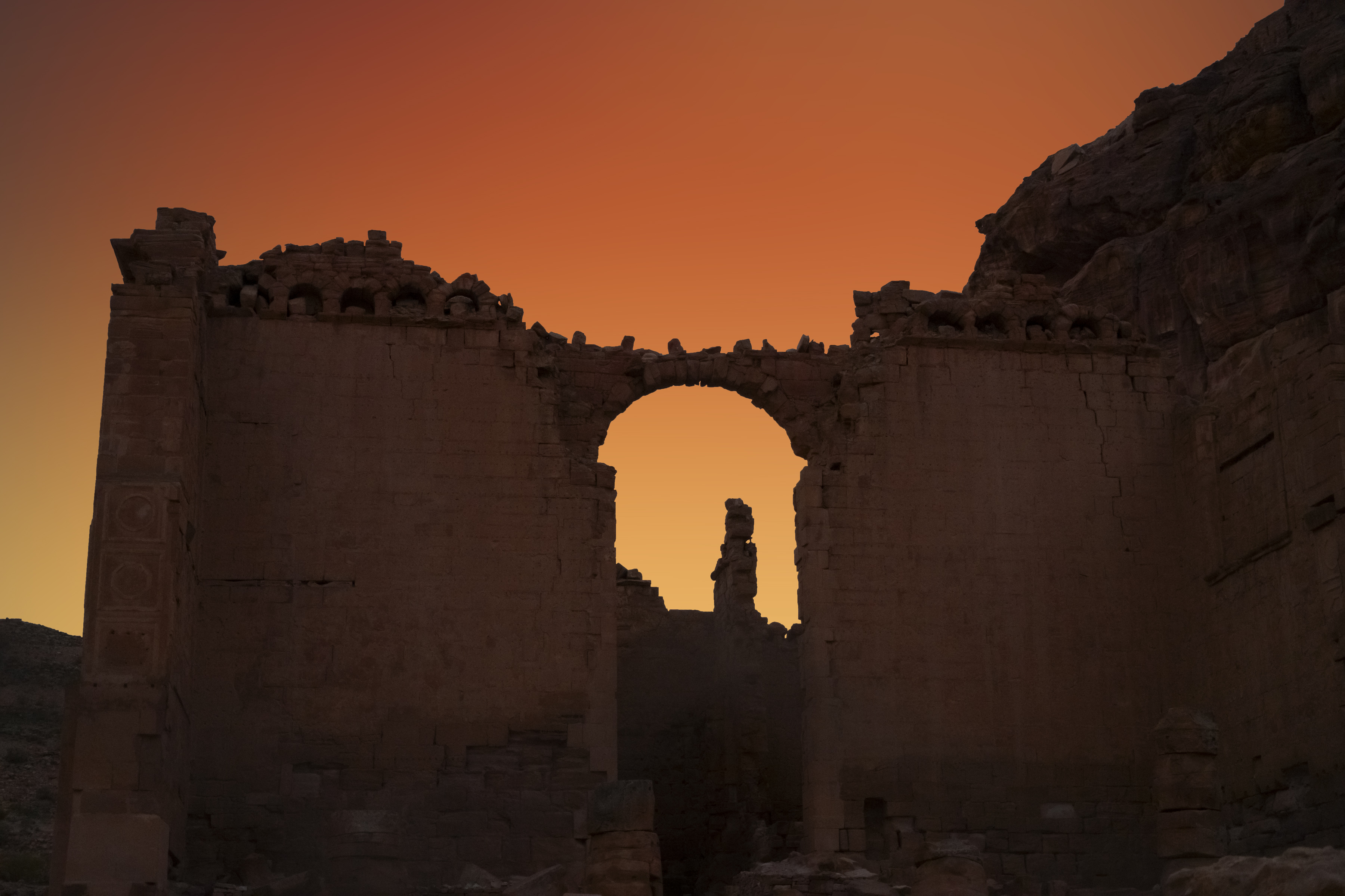 Солнце спускается. Предстоит долгий путь назад, и уже давно пора возвращаться. Мы проделываем путь по каменным ступеням вниз, выходим к Римскому городу и застаем Дворец дочери фараона (Эль-Бинт) уже в виде силуэта на побагровевшем небе.