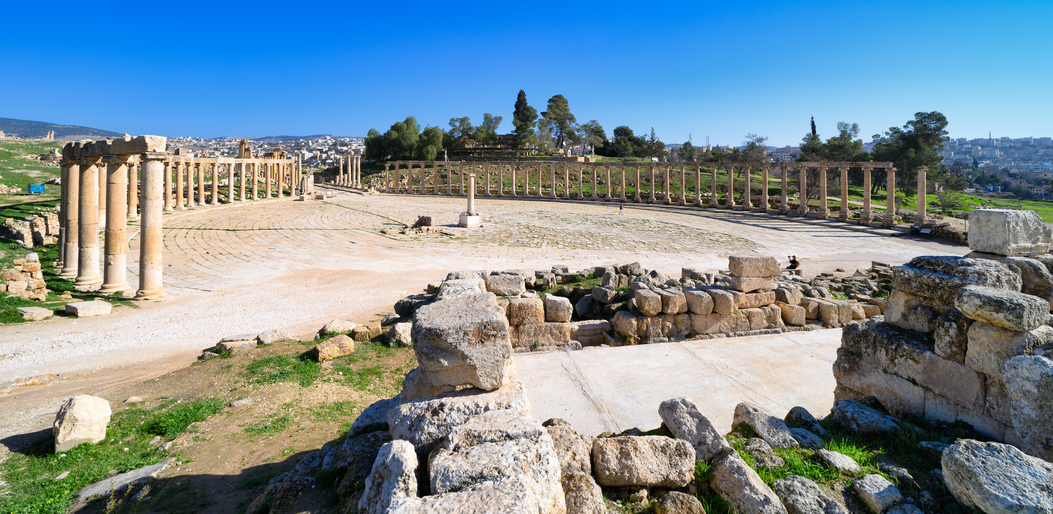 Самое эффектное место в Джераше — Овальная площадь, вымощенная мрамором и с трех сторон окруженная колоннами. Из-за центрального столба в геометрическом центре все сооружение напоминает циферблат гигантских часов со снятыми стрелками.