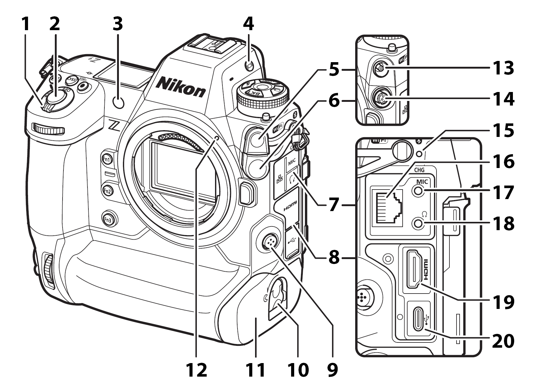 1 — рычажок выключателя питания; 2 — кнопка спуска затвора; 3 — прожектор подсветки АФ, подавления эффекта «красных глаз» и индикатор автоспуска; 4 — кнопка переключения вывода картинки на дисплей или в видоискатель; 5 — крышка коаксиального разъема (13) синхронизации с импульсными осветителями; 6 — крышка 10-контактного разъема (14) для подключения проводного пульта ДУ; 7 — крышка аудиоразъемов (17, 18) и коннектора RJ-45 (16) гигабитной сети Ethernet; 8 — крышка отсека с разъемами HDMI (19) и USB (20); 9 — кнопка выбора режима фокусировки; 10 — замок крышки отсека для аккумулятора; 11 — крышка отсека для аккумулятора; 12 — метка для совмещения объектива при установке в байонет; 13 — коаксиальный разъем для кабеля синхронизации со вспышками; 14 — 10-контактный разъем проводного пульта ДУ; 15 — индикатор зарядка аккумулятора; 16 — разъем RJ-45 гигабитной сети Ethernet; 17 — аудиовход внешнего микрофона; 18 — аудиовыход на наушники; 19 — видеовыход HDMI; 20 — разъем USB.