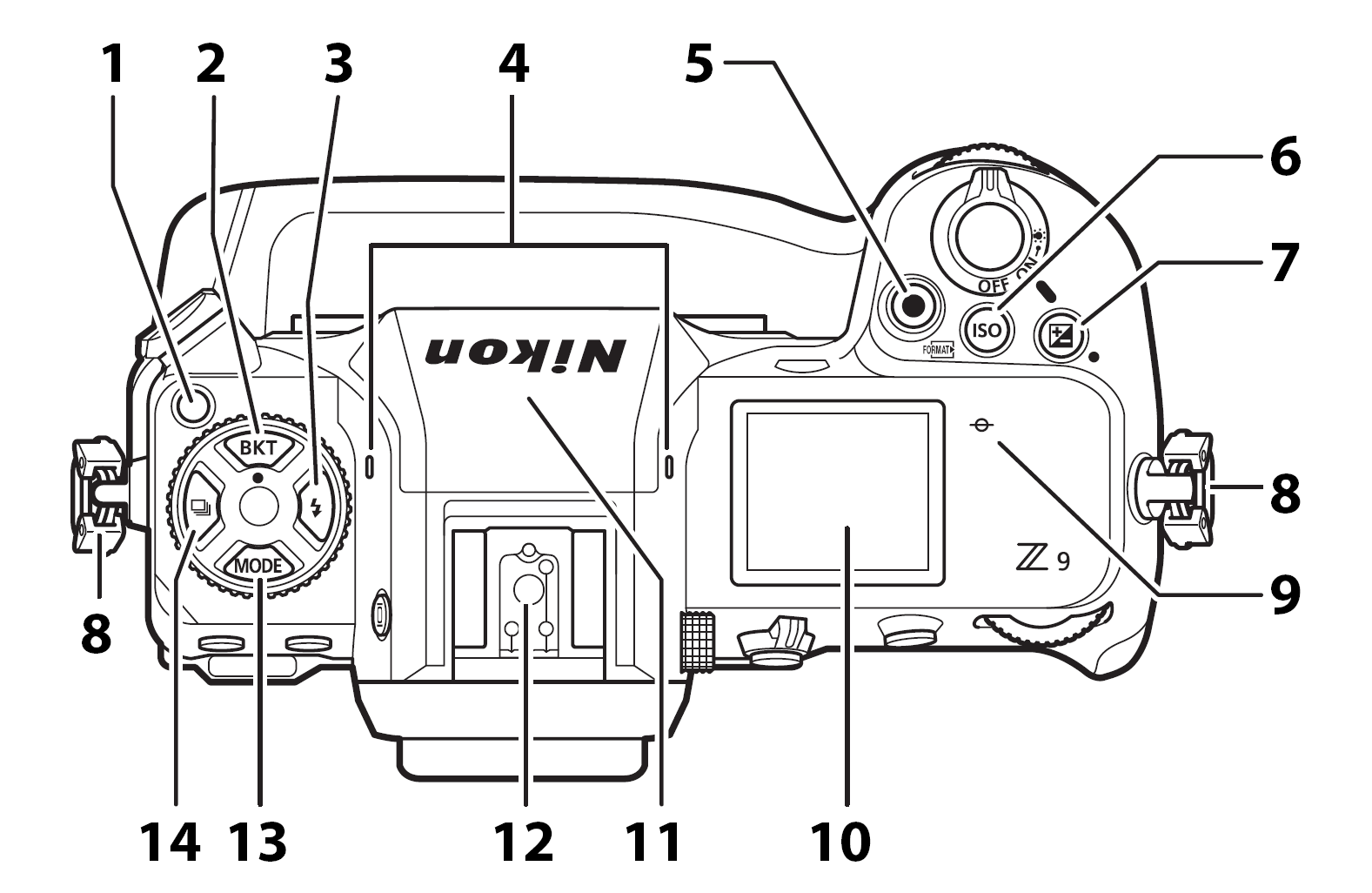 В этой же проекции стоит обратить внимание на зоны герметизации корпуса, предохраняющие уязвимые внутренности Nikon Z9 от воздействия пыли и влаги окружающей среды.