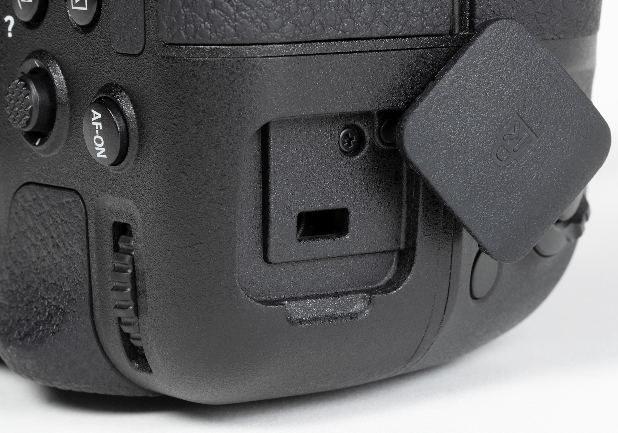 Справа возле объектива расположена панель с коаксиальным разъемом синхронизации для вспышек и 10-контактным разъемом пульта ДУ. Это четвертый признак профессиональной камеры.