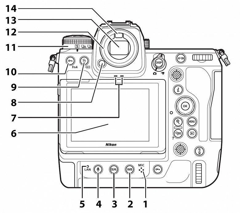 1 — микрофон для записи голосовых комментариев; 2 — кнопка WB установки баланса белого; 3 — кнопка Qual установки качества сохраняемых изображений; 4 — кнопка активации записи голосовых комментариев на встроенный микрофон; 5 — индикатор активности передачи данных по сети Ethernet; 6 — дисплей; 7 — громкоговоритель; 8 — кнопка разблокировки наглазника; 9 — кнопка стирания отснятого материала и форматирования карт памяти; 10 — кнопка Fn4; 11 — селектор режимов «протяжки»; 12 — резиновое обрамление наглазника; 13 — видоискатель; 14 — датчик приближения глаза к окуляру.