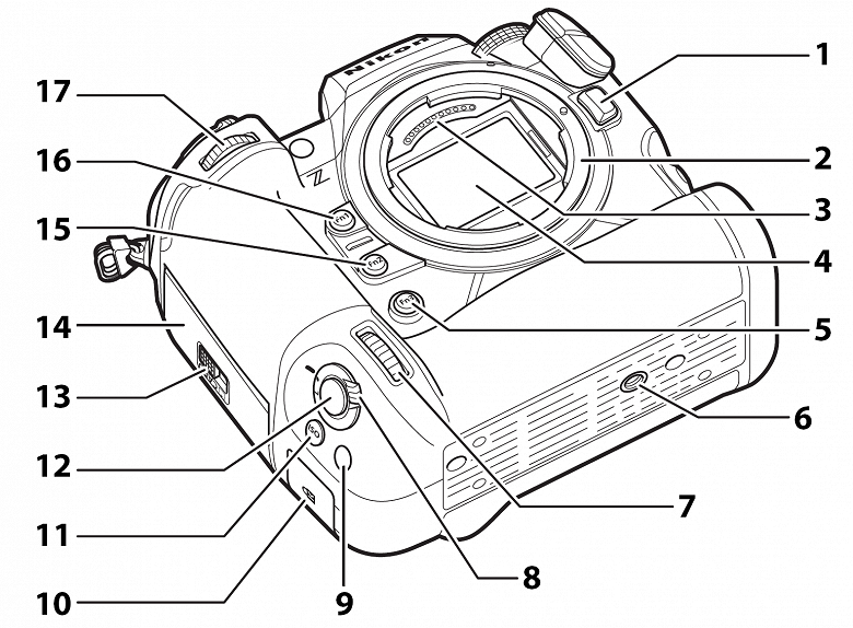 1 — кнопка разблокировки крепления объектива в байонете; 2 — байонетное крепление; 3 — контактная группа объектива; 4 — сенсор изображения; 5 — кнопка Fn3; 6 — штативная резьба; 7 — главный (передний) диск управления на вертикальной ручке; 8 — рычажок блокировки спуска затвора на вертикальной ручке; 9 — кнопка Fn на вертикальной ручке; 10 — отсек с креплением для кабеля безопасности; 11 — кнопка вызова установок ISO на вертикальной ручке; 12 — кнопка спуска затвора на вертикальной ручке; 13 — замок крышки отсека для карт памяти; 14 — крышка отсека для карт памяти; 15 — кнопка Fn2; 16 — кнопка Fn1; 17 — передний диск установки параметров.