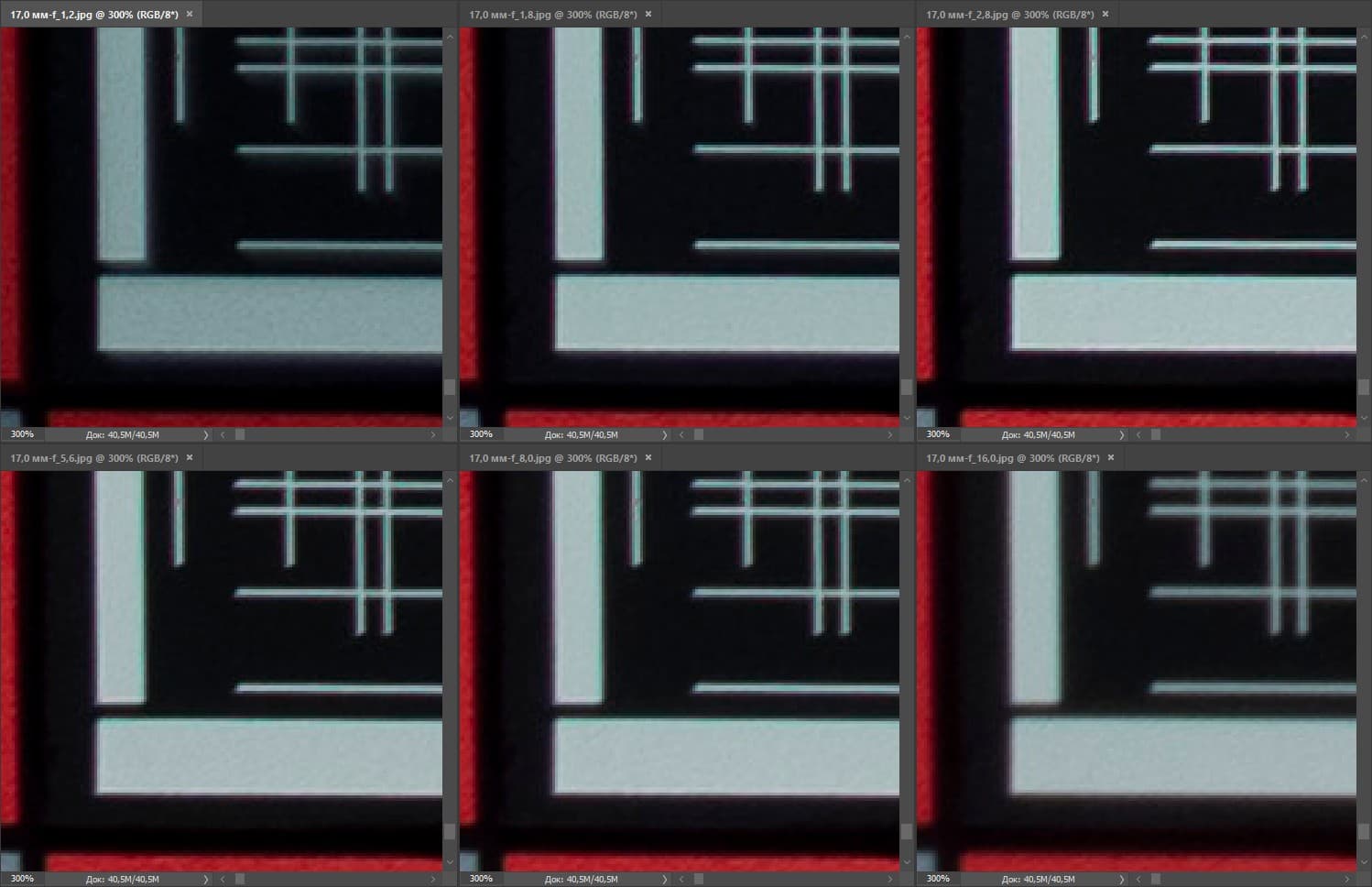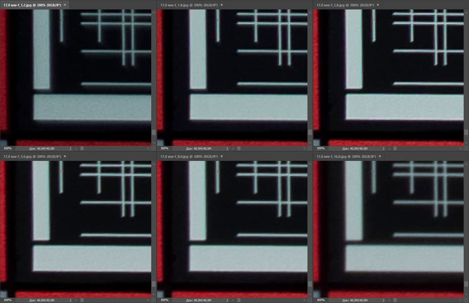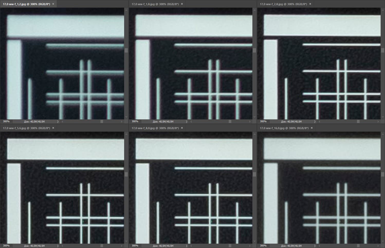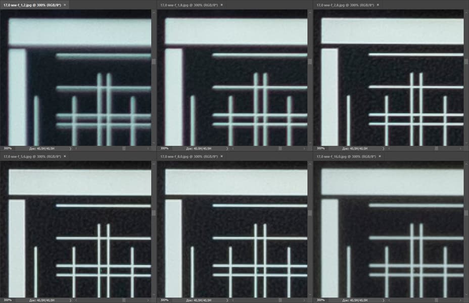 Объектив демонстрирует хорошую резкость даже при максимальном раскрытии. По мере диафрагмирования детализация растет, становится очень хорошей уже при F1,4 и отличной при F2. Максимальная резкость достигается при F4—F8, а дальнейшее диафрагмирование приводит к ее понижению — видимо, вследствие пагубного влияния дифракции.