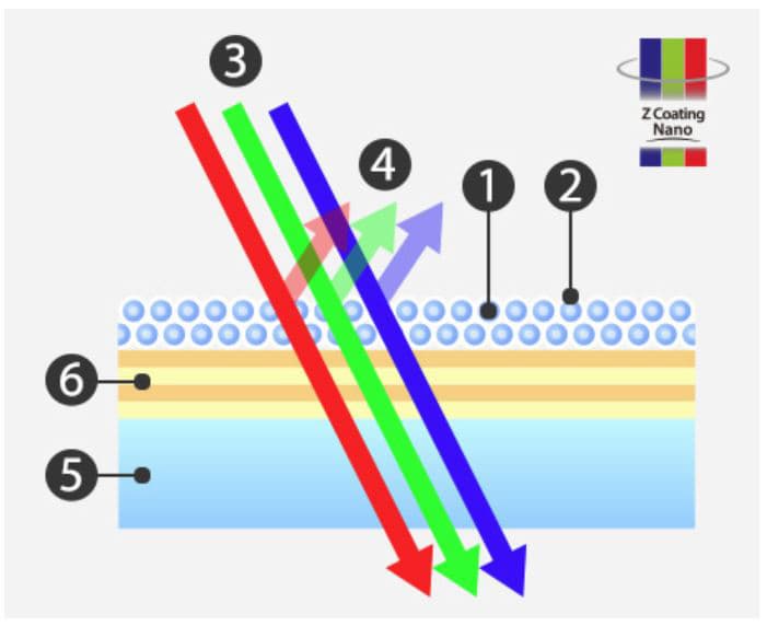 Поверхности линз Olympus M.Zuiko Digital ED 17mm F1.2 Pro имеют «фирменное» покрытие производителя, именуемое Zero Coating Nano. Оно состоит из наночастиц, размеры которых меньше длины полуволны света видимого спектра. Эти частицы располагаются поверх традиционного многослойного просветления и препятствуют образованию паразитных отражений, направленных вглубь оптической среды.