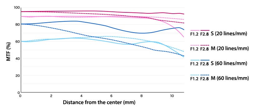 Производитель публикует графики Modular Transfer Function. Сплошными линиями представлены кривые для сагиттальных структур (S), пунктирными — для меридиональных (M); теплыми цветами обозначены характеристики для 20 линий/мм: розовым при F1,2, темно-красным при F2,8. Холодными цветами выделены характеристики для 60 линий/мм: голубым при F1,2, синим при F2,8. По оси абсцисс отложена дистанция от центра изображения к периферии в мм.