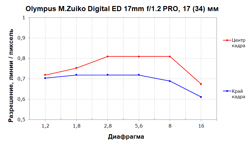 Разрешающая способность при полном раскрытии диафрагмы не очень высокая: на уровне 70% в центре и на краю кадра. К тому же можно заметить небольшое падение контраста, которое приходит в норму уже при F1,8. При диафрагмировании до F2,8-F5,6 разрешение держится стабильно на уровне 80% в центре и 70% на краях — это хороший результат для умеренно-широкоугольного объектива (даже при учете кроп-фактора 2).