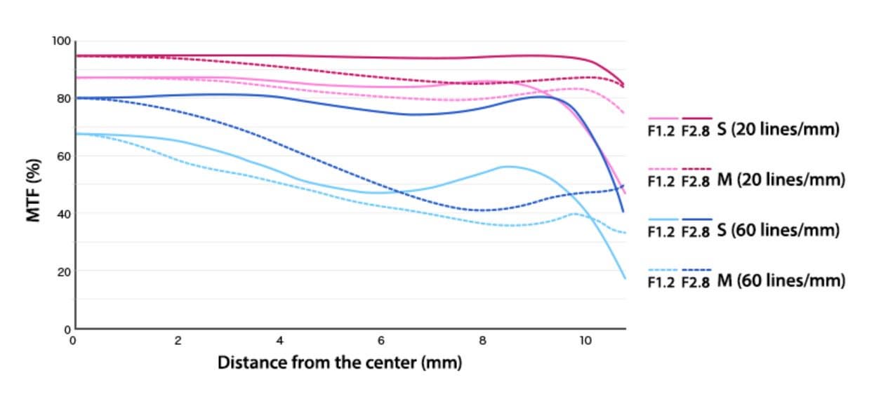 Производитель публикует графики MTF (Modular Transfer Function), или частотно-контрастной характеристики. На них сплошными линиями представлены кривые для сагиттальных структур (S), пунктирными — для меридиональных (M); теплыми цветами обозначены характеристики для 20 линий/мм: розовым при F1,2, темно-красным при F2,8. Холодными цветами выделены характеристики для 60 линий/мм: голубым при F1,2, синим при F2,8. По оси абсцисс отложена дистанция от центра изображения к периферии в миллиметрах.