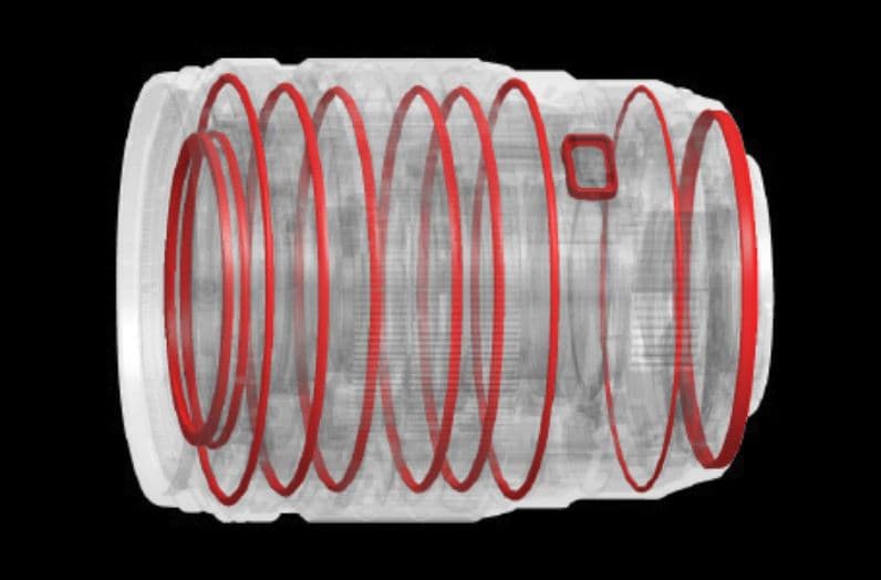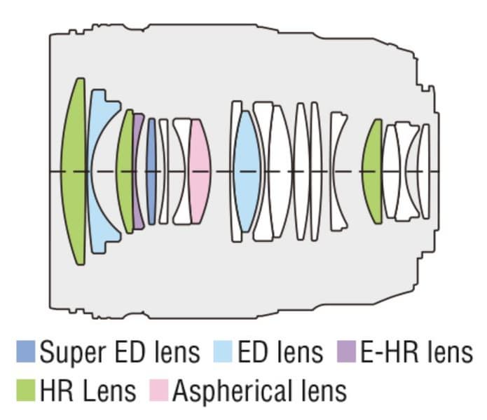 | Оптическая схема | 19 элементов в 14 группах, включая один асферический элемент, один Super ED и один E-HR, а также две линзы ED и три HR |