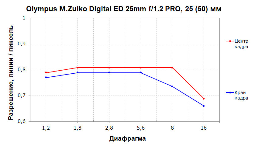 Разрешающая способность довольно высокая практически во всем диапазоне диафрагмирования, причем она держится на уровне 80% и в центре, и на краю кадра. С учетом кроп-фактора результат не кажется таким уж высоким, но стабильность разрешения все равно сильно подкупает.