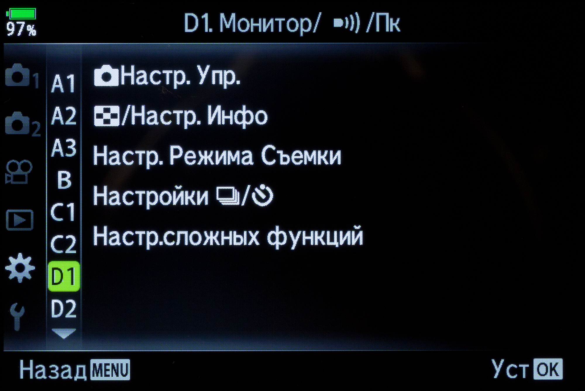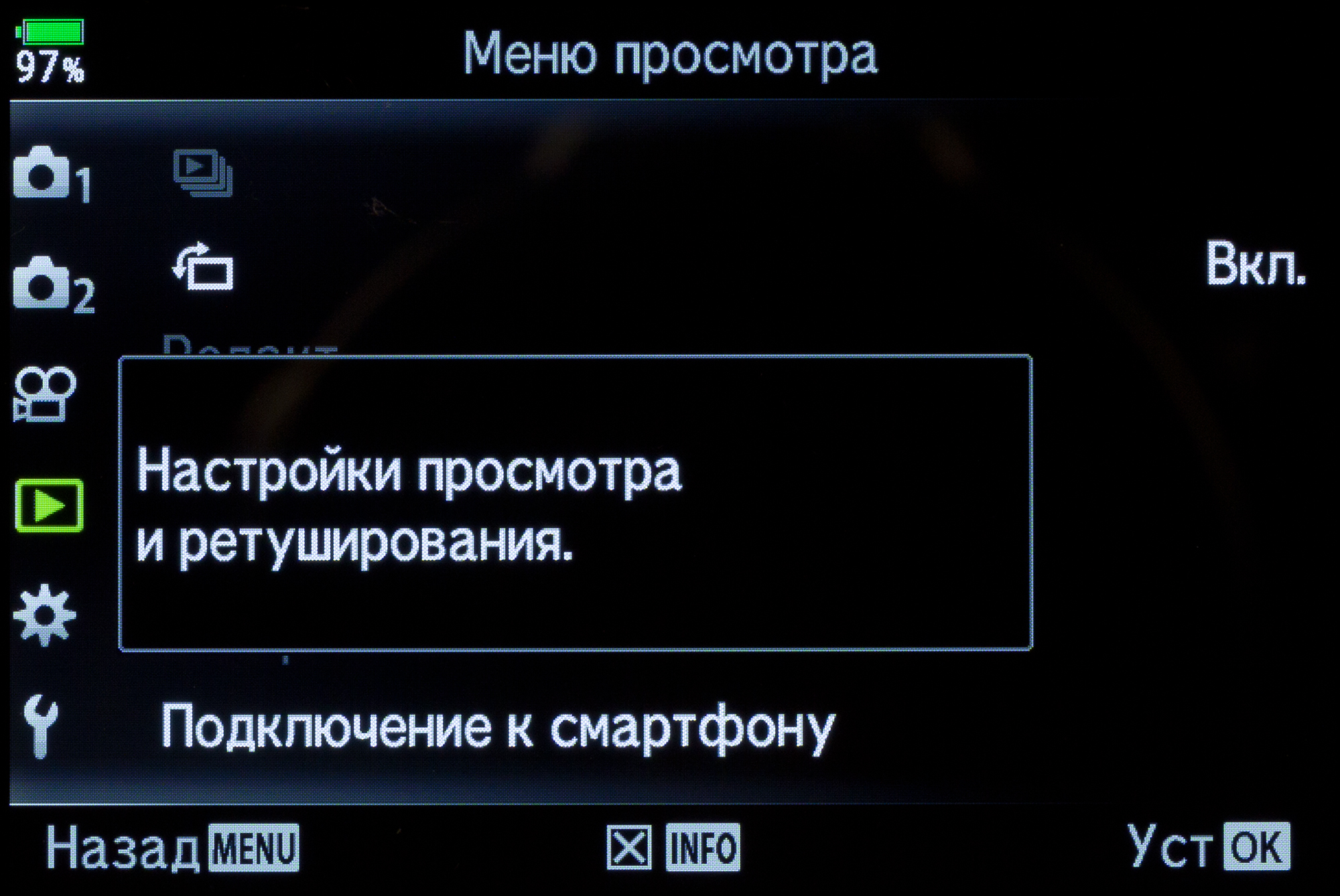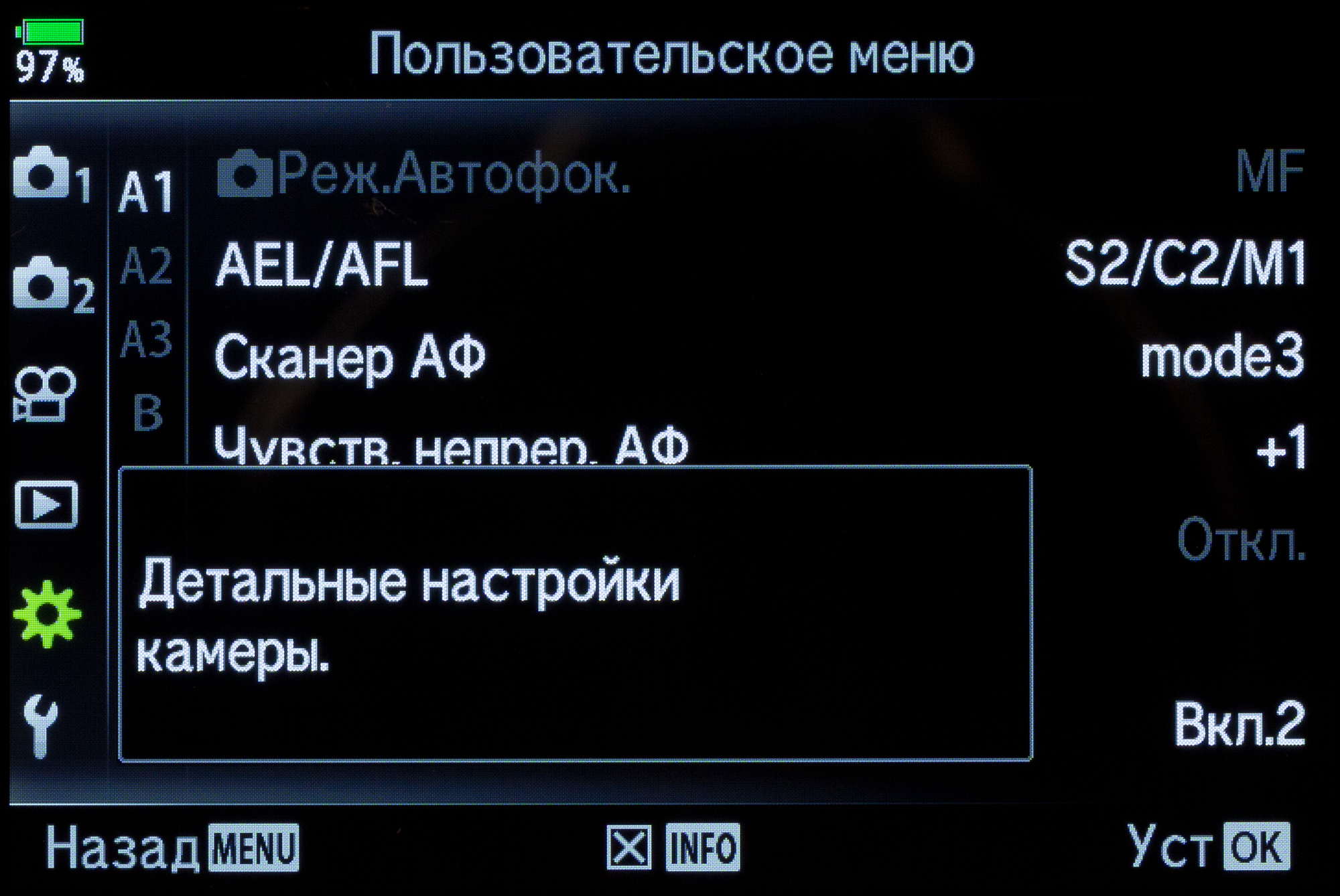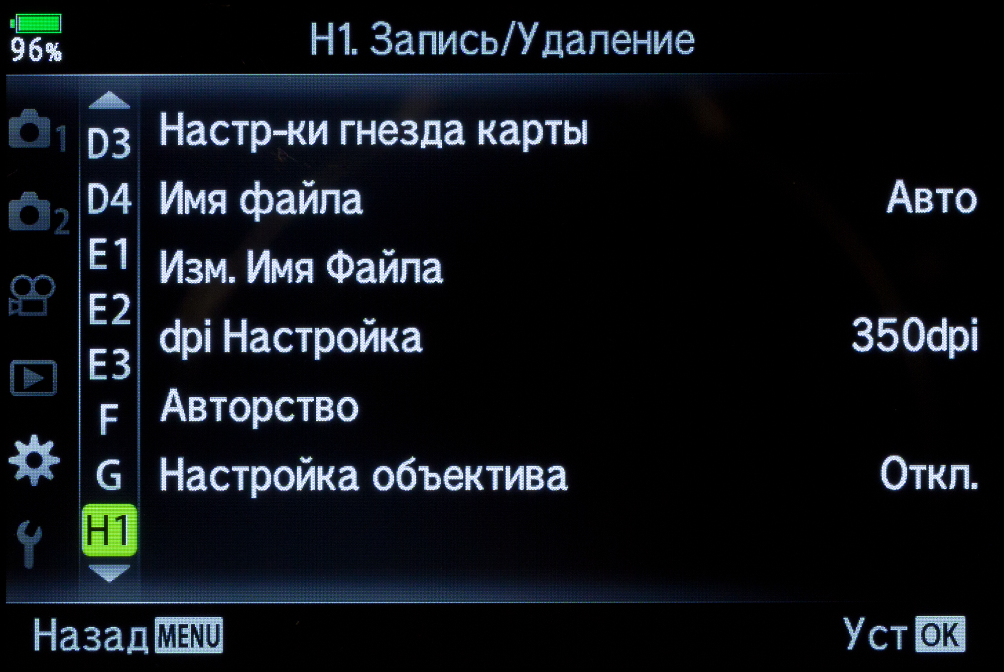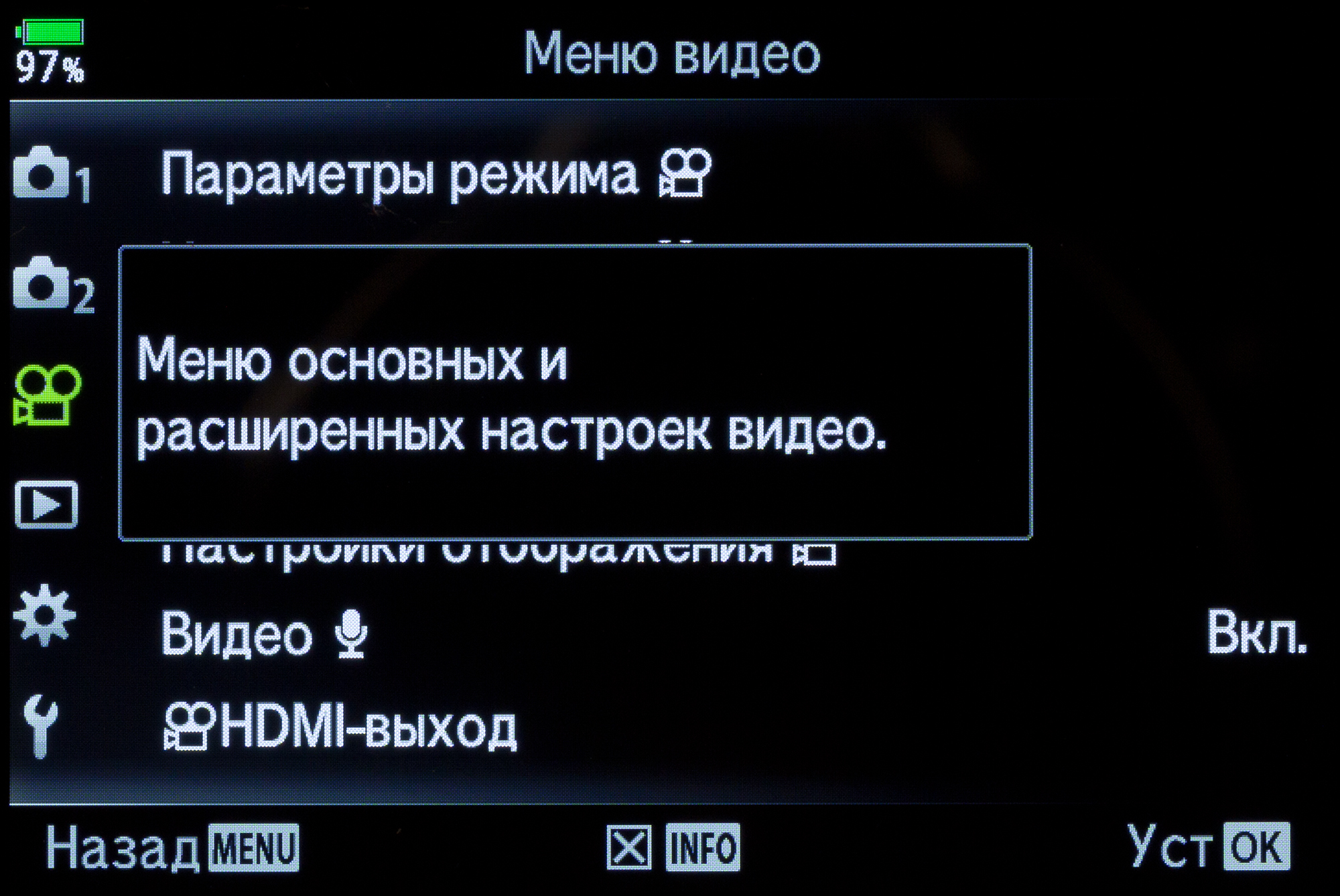 Блоки опций собраны в группы: фотосъемка 1/2, съемка видео, просмотр, пользовательское меню и настройки. Далее следует ветвление меню до второго, а иногда — третьего, четвертого (и далее) порядков вложения. Каждый пункт снабжен разъяснением-подсказкой. Мы не станем подробно описывать устройство и работу с меню, так как это выходит за рамки нашего материала и, кроме того, весьма подробно описано в руководстве пользователя (его можно скачать с официального сайта производителя). Приведем лишь наиболее важные скриншоты.