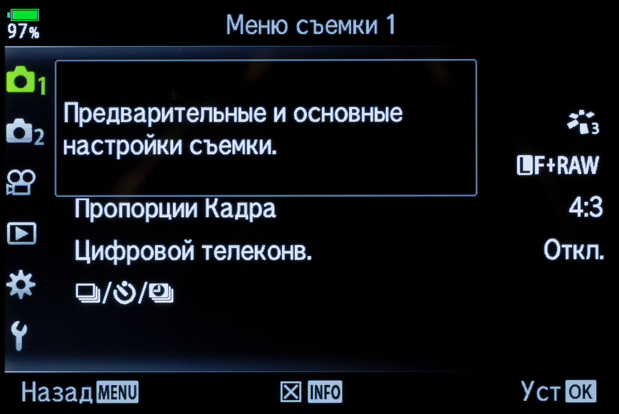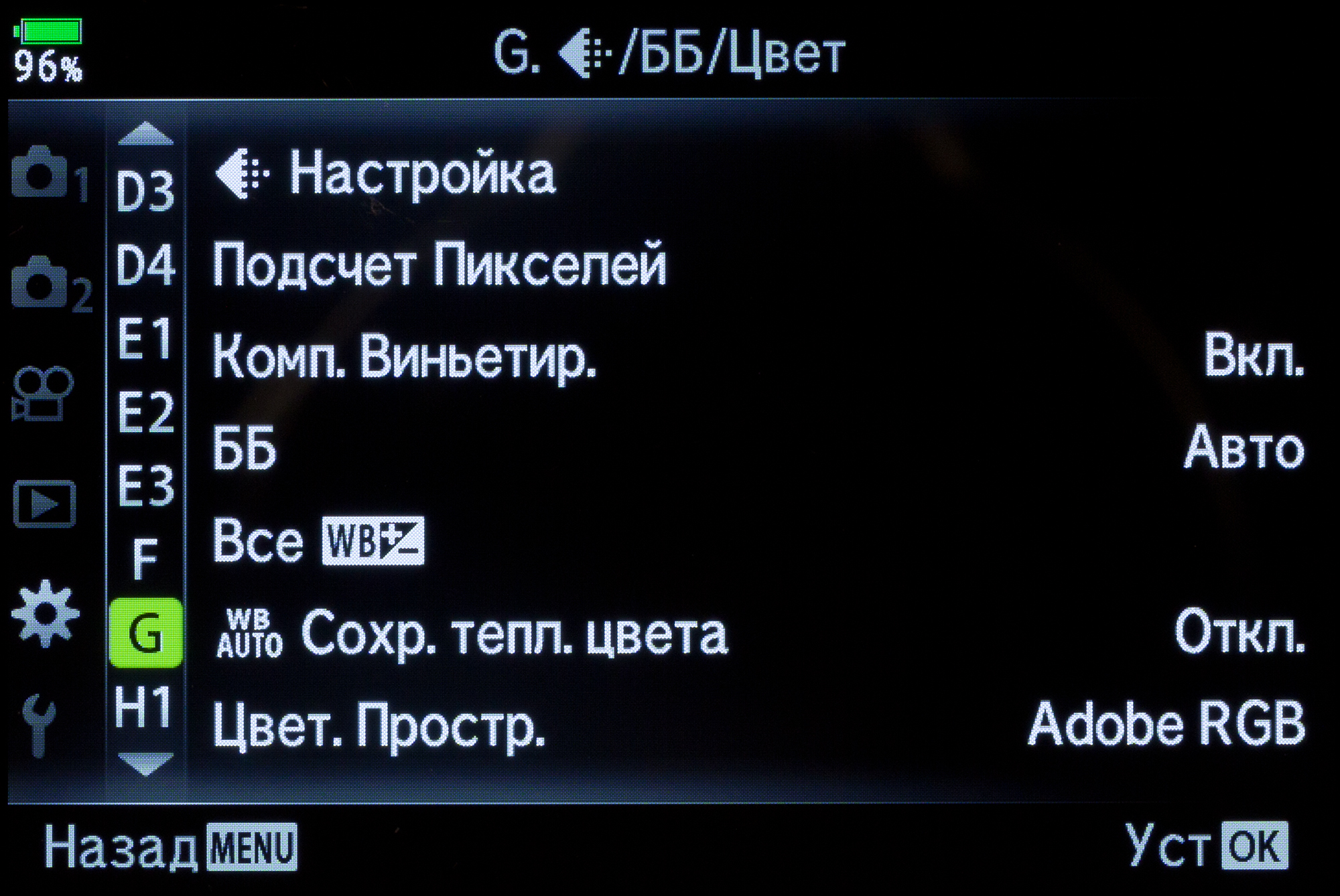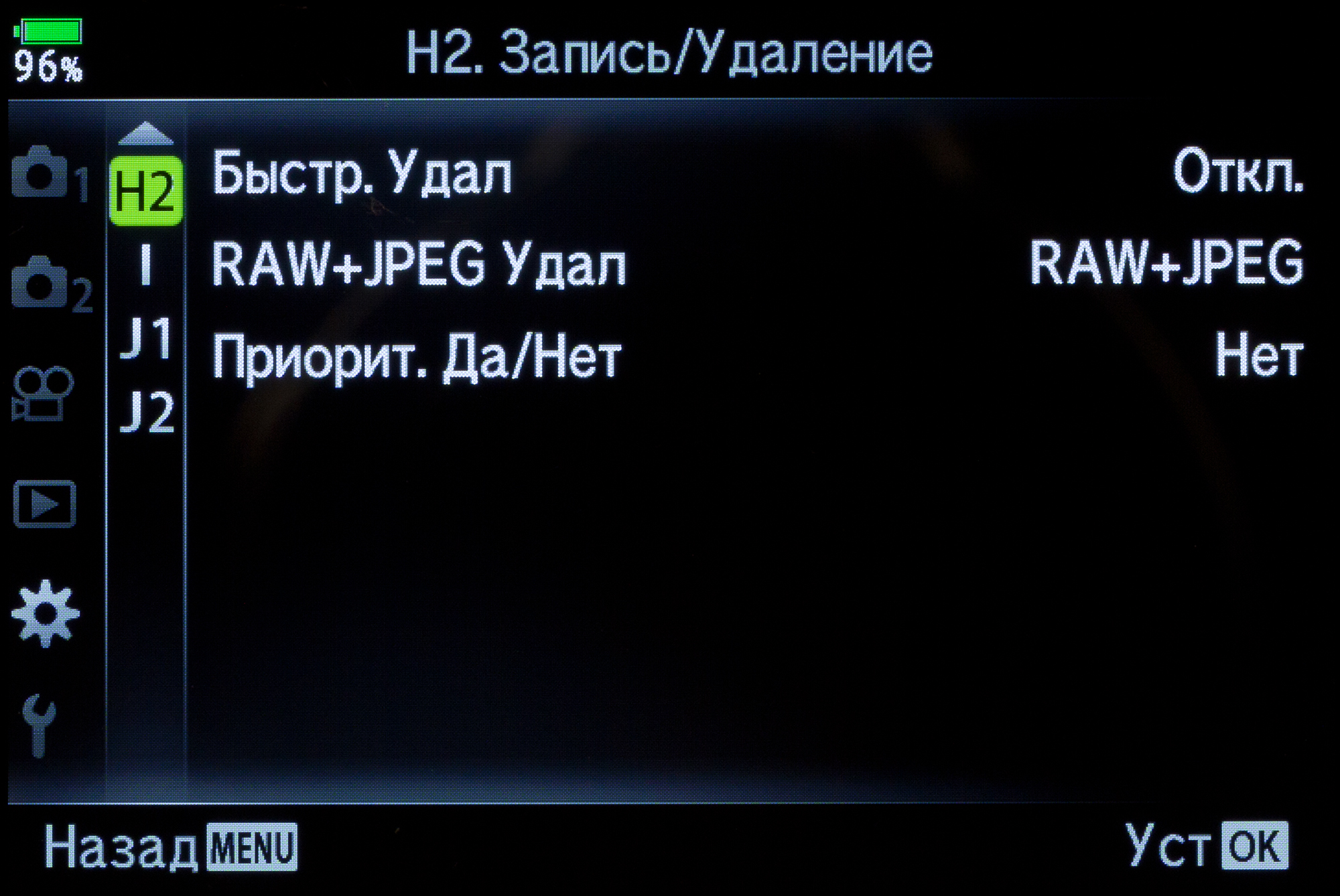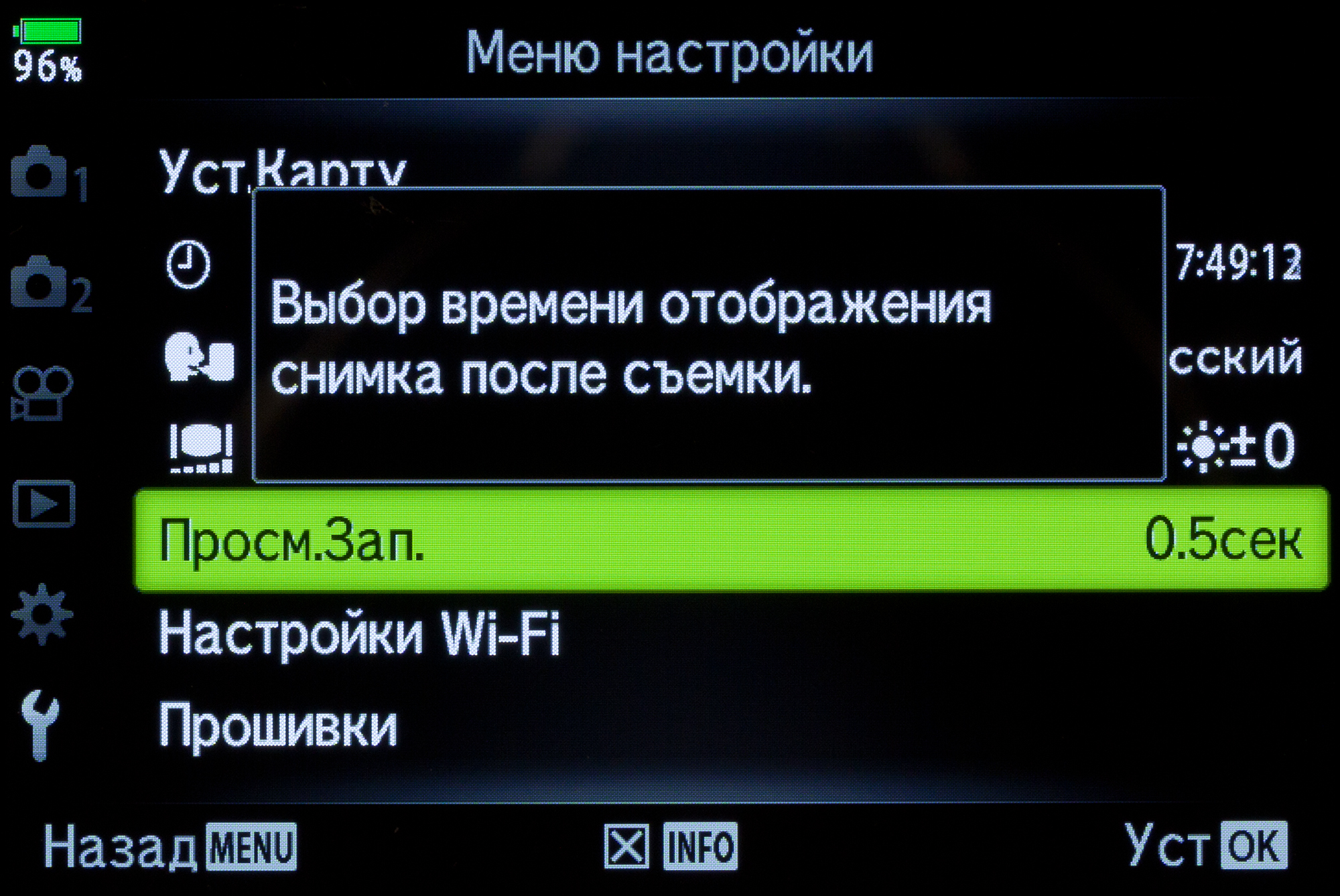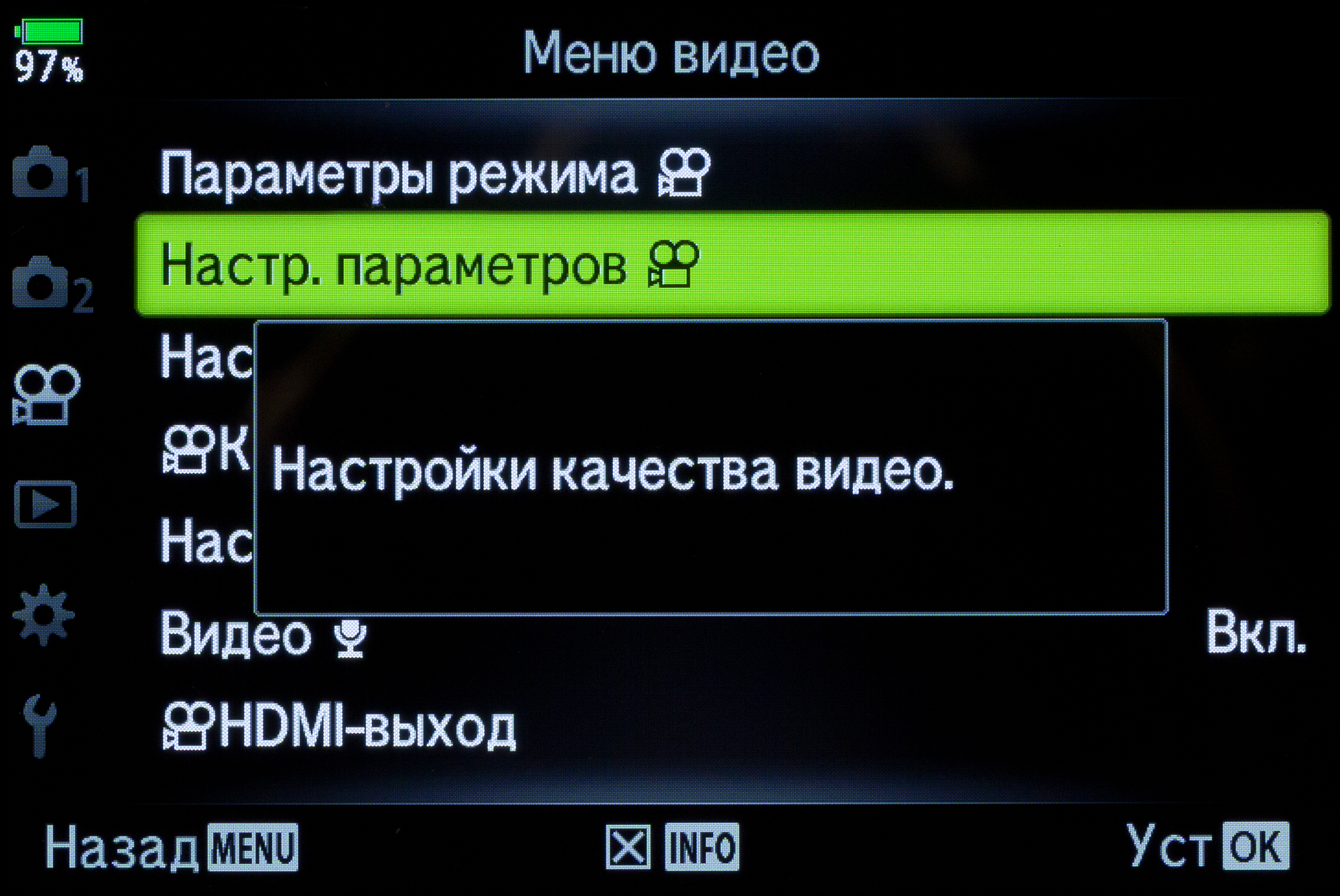 Блоки опций собраны в группы: фотосъемка 1/2, съемка видео, просмотр, пользовательское меню и настройки. Далее следует ветвление меню до второго, а иногда — третьего, четвертого (и далее) порядков вложения. Каждый пункт снабжен разъяснением-подсказкой. Мы не станем подробно описывать устройство и работу с меню, так как это выходит за рамки нашего материала и, кроме того, весьма подробно описано в руководстве пользователя (его можно скачать с официального сайта производителя). Приведем лишь наиболее важные скриншоты.