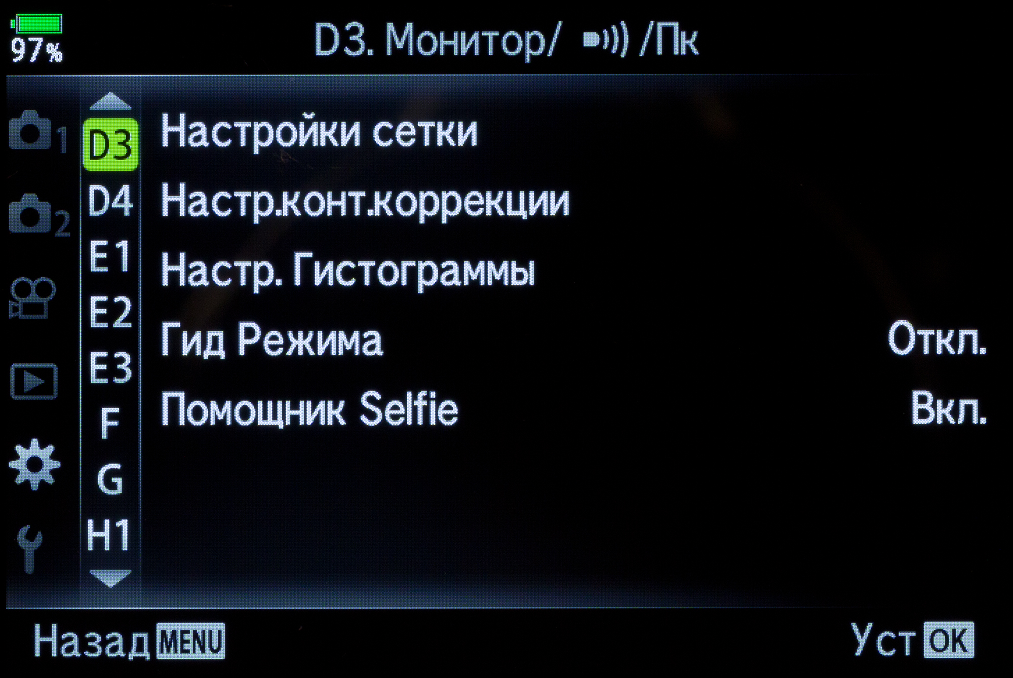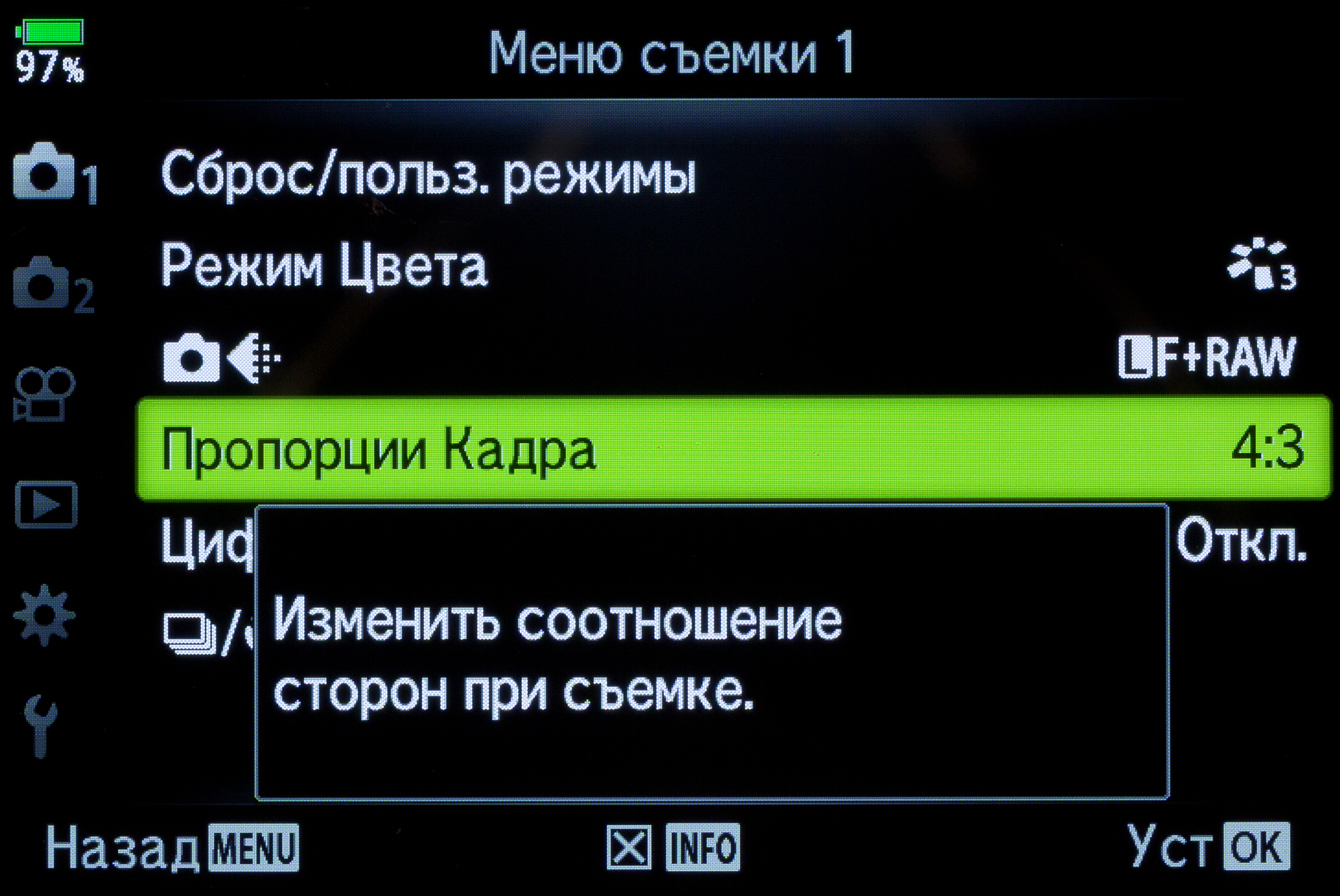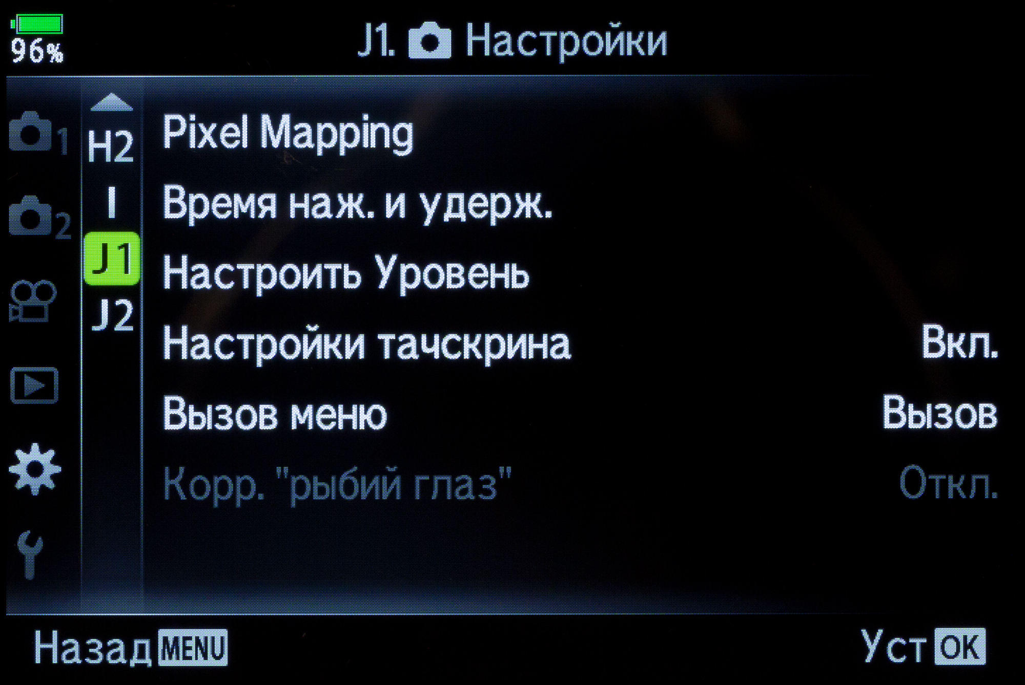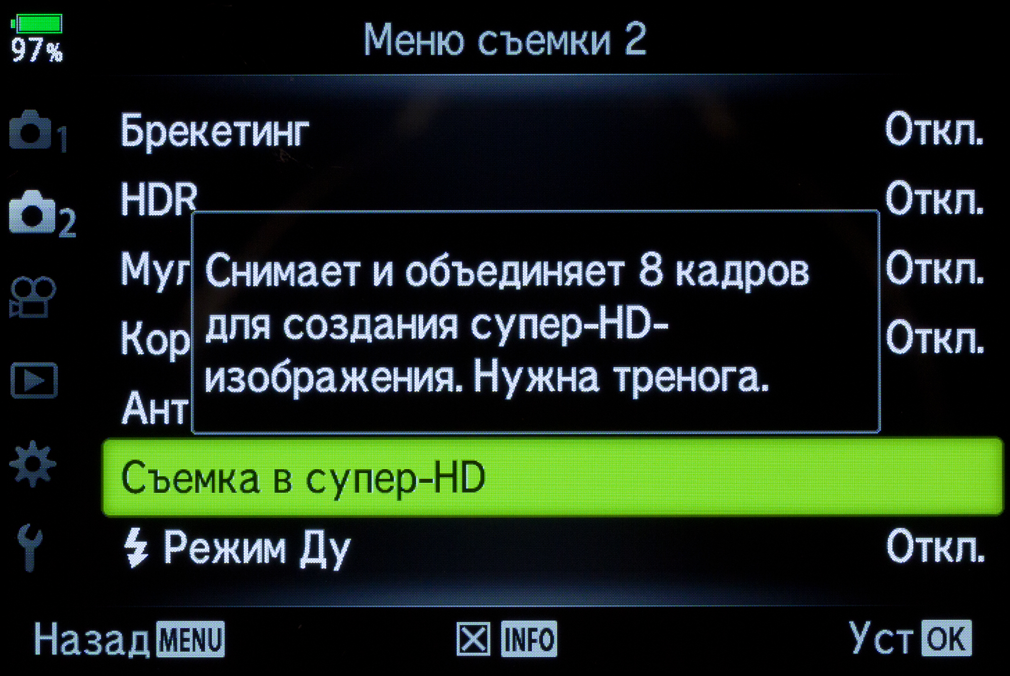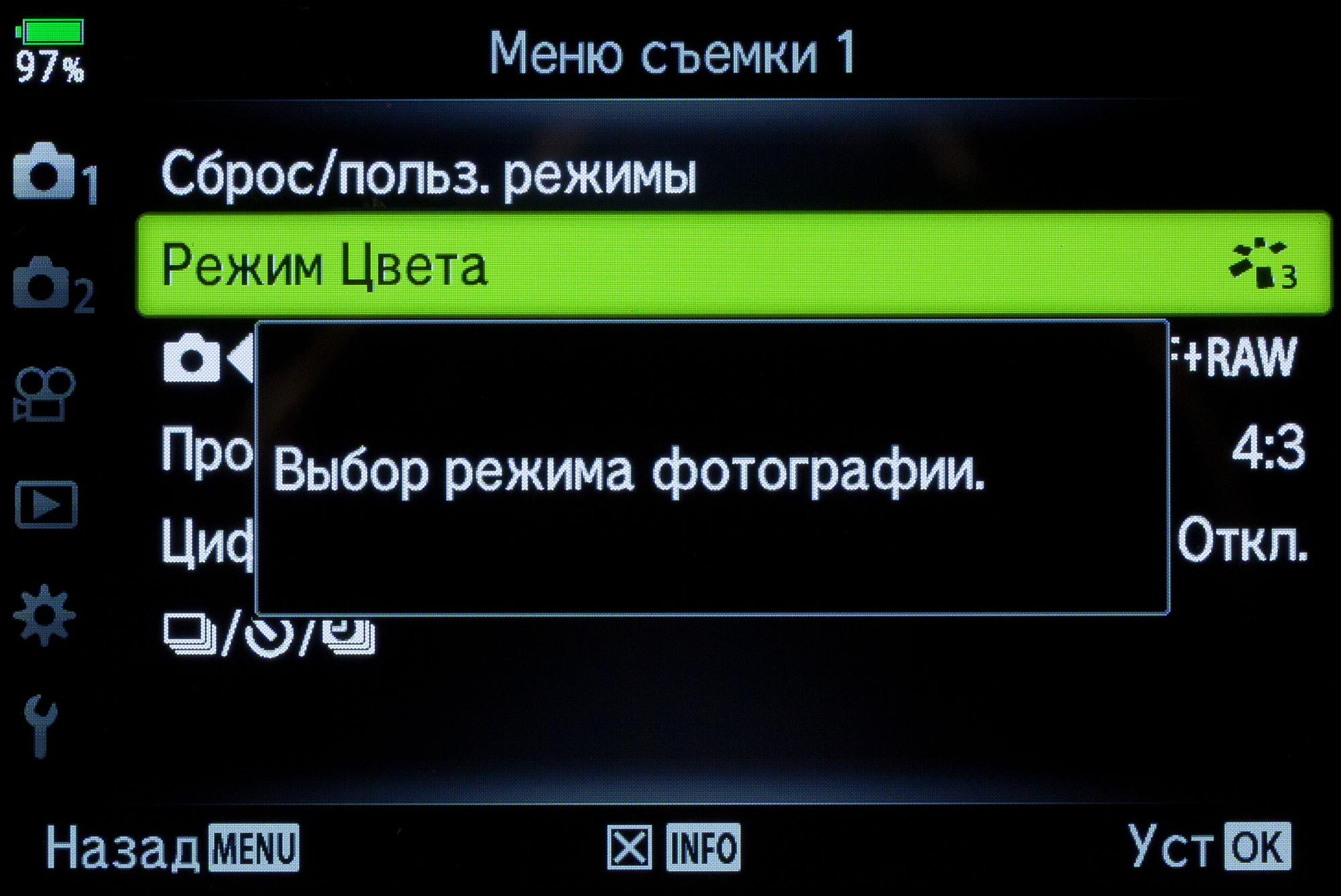 Блоки опций собраны в группы: фотосъемка 1/2, съемка видео, просмотр, пользовательское меню и настройки. Далее следует ветвление меню до второго, а иногда — третьего, четвертого (и далее) порядков вложения. Каждый пункт снабжен разъяснением-подсказкой. Мы не станем подробно описывать устройство и работу с меню, так как это выходит за рамки нашего материала и, кроме того, весьма подробно описано в руководстве пользователя (его можно скачать с официального сайта производителя). Приведем лишь наиболее важные скриншоты.