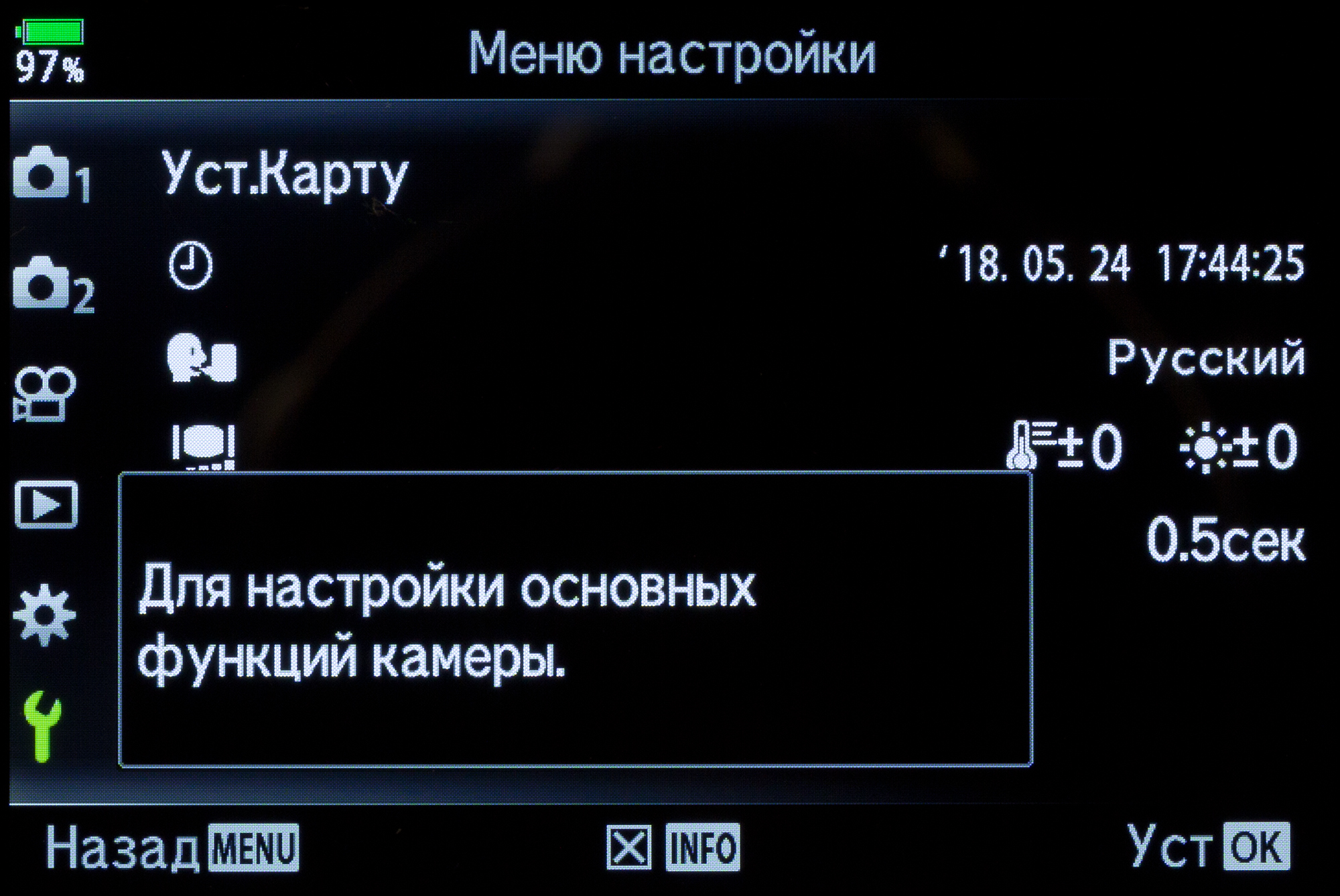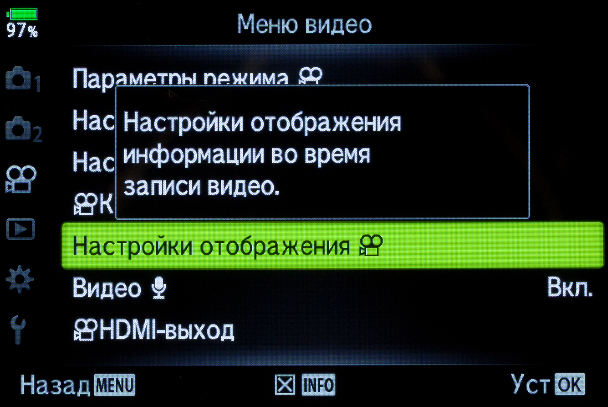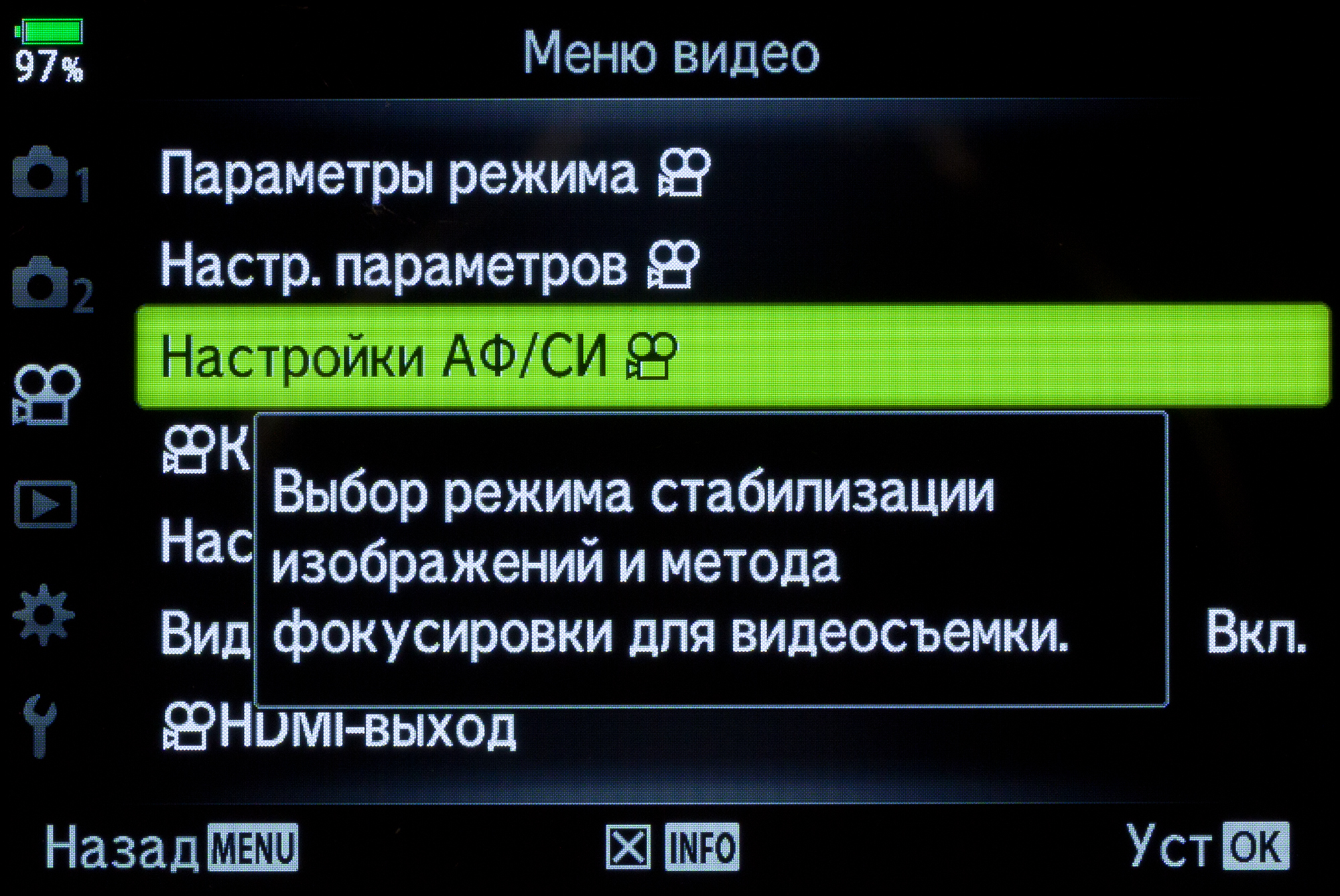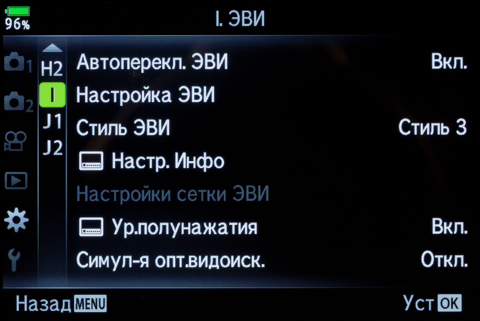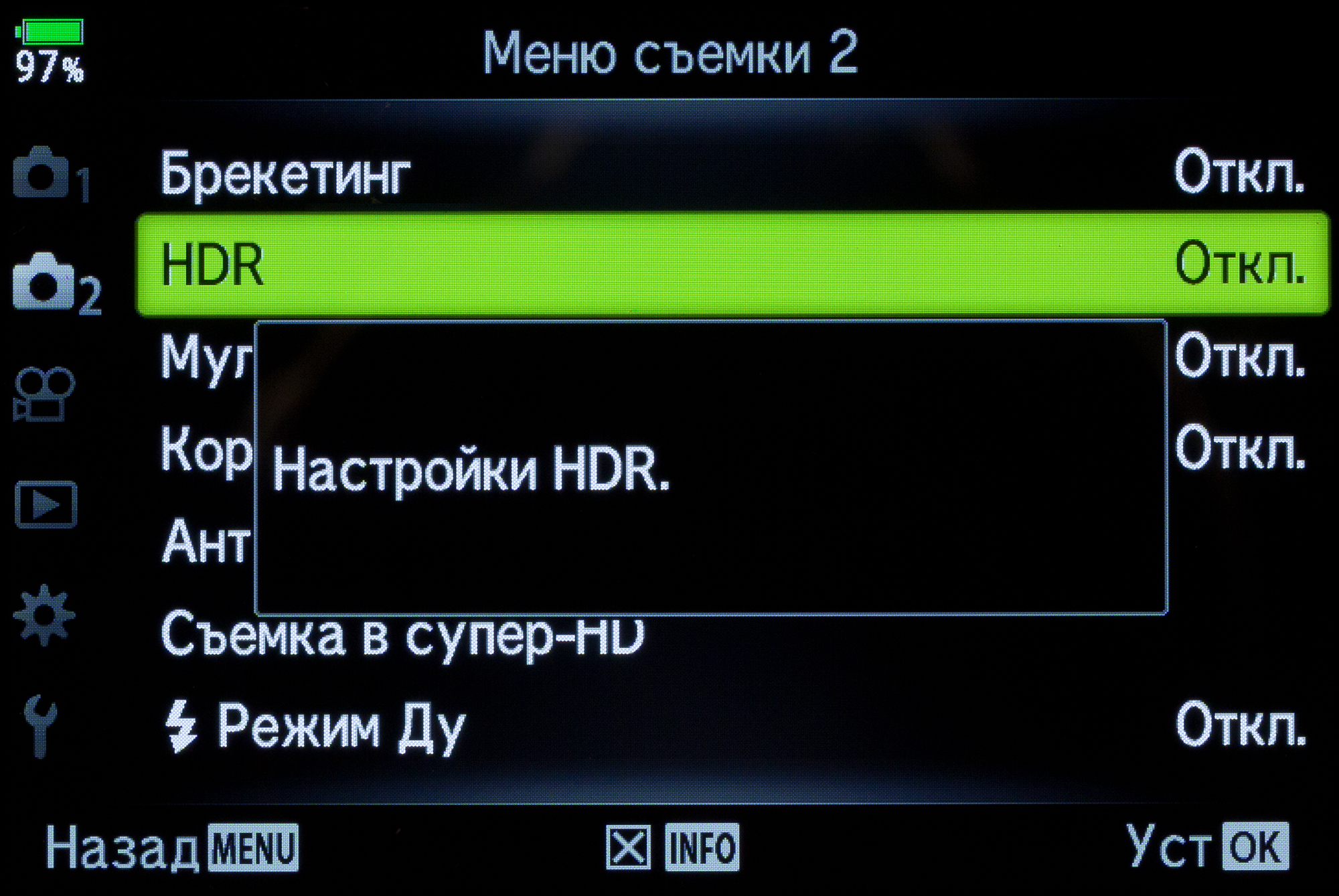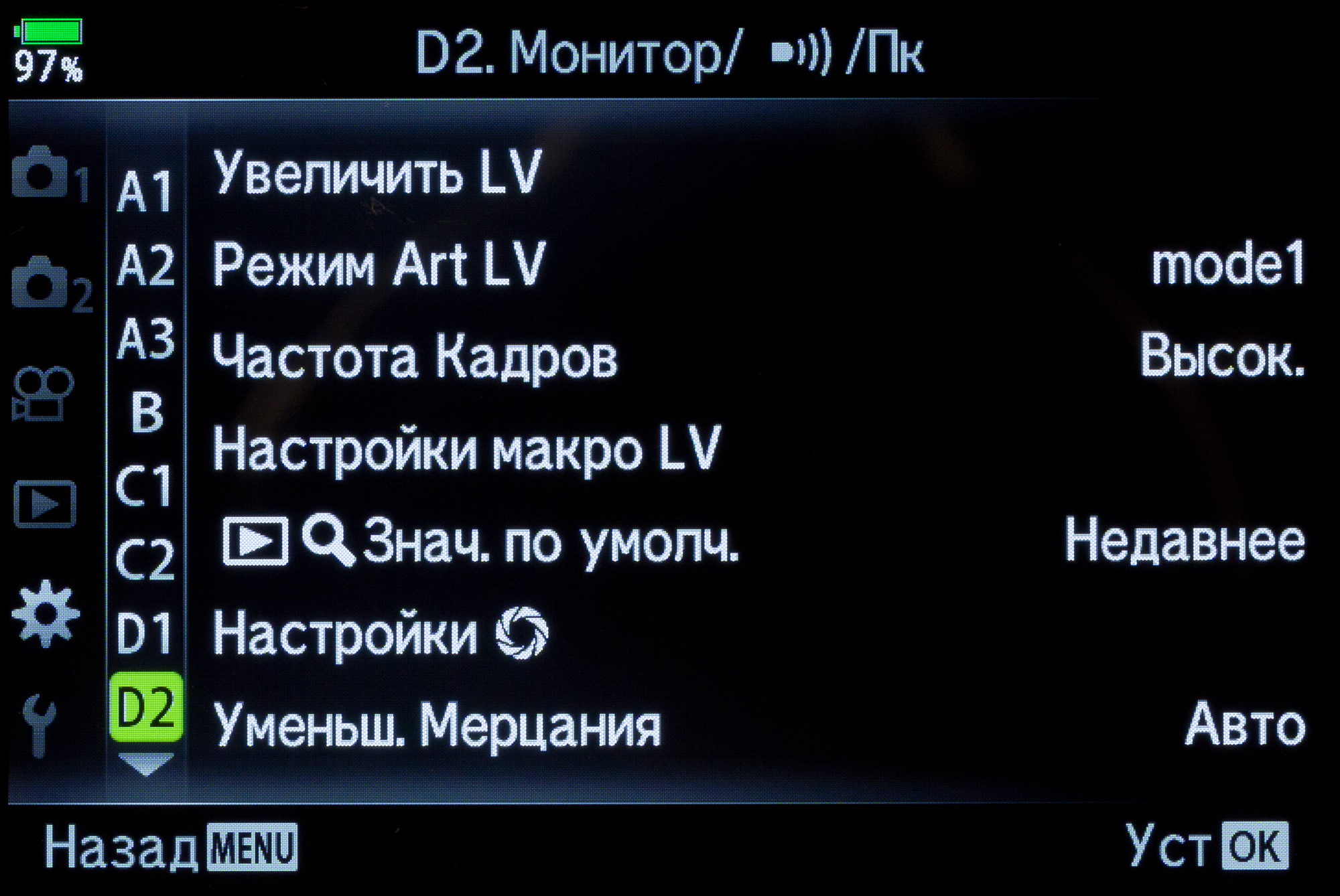Блоки опций собраны в группы: фотосъемка 1/2, съемка видео, просмотр, пользовательское меню и настройки. Далее следует ветвление меню до второго, а иногда — третьего, четвертого (и далее) порядков вложения. Каждый пункт снабжен разъяснением-подсказкой. Мы не станем подробно описывать устройство и работу с меню, так как это выходит за рамки нашего материала и, кроме того, весьма подробно описано в руководстве пользователя (его можно скачать с официального сайта производителя). Приведем лишь наиболее важные скриншоты.