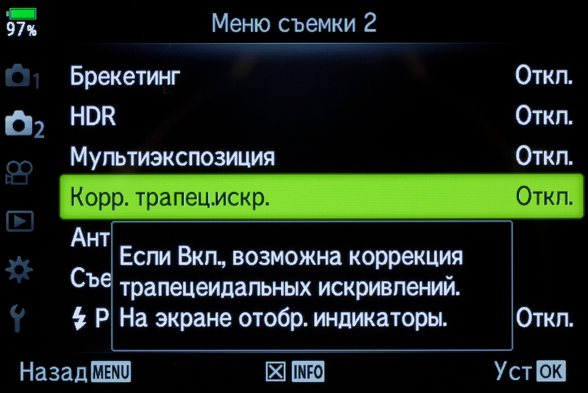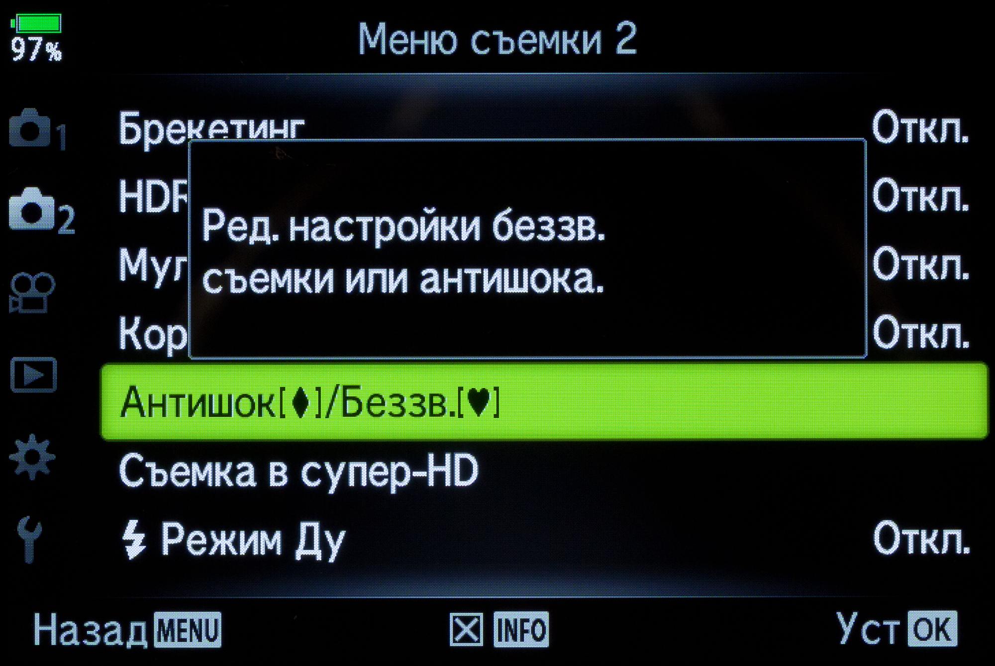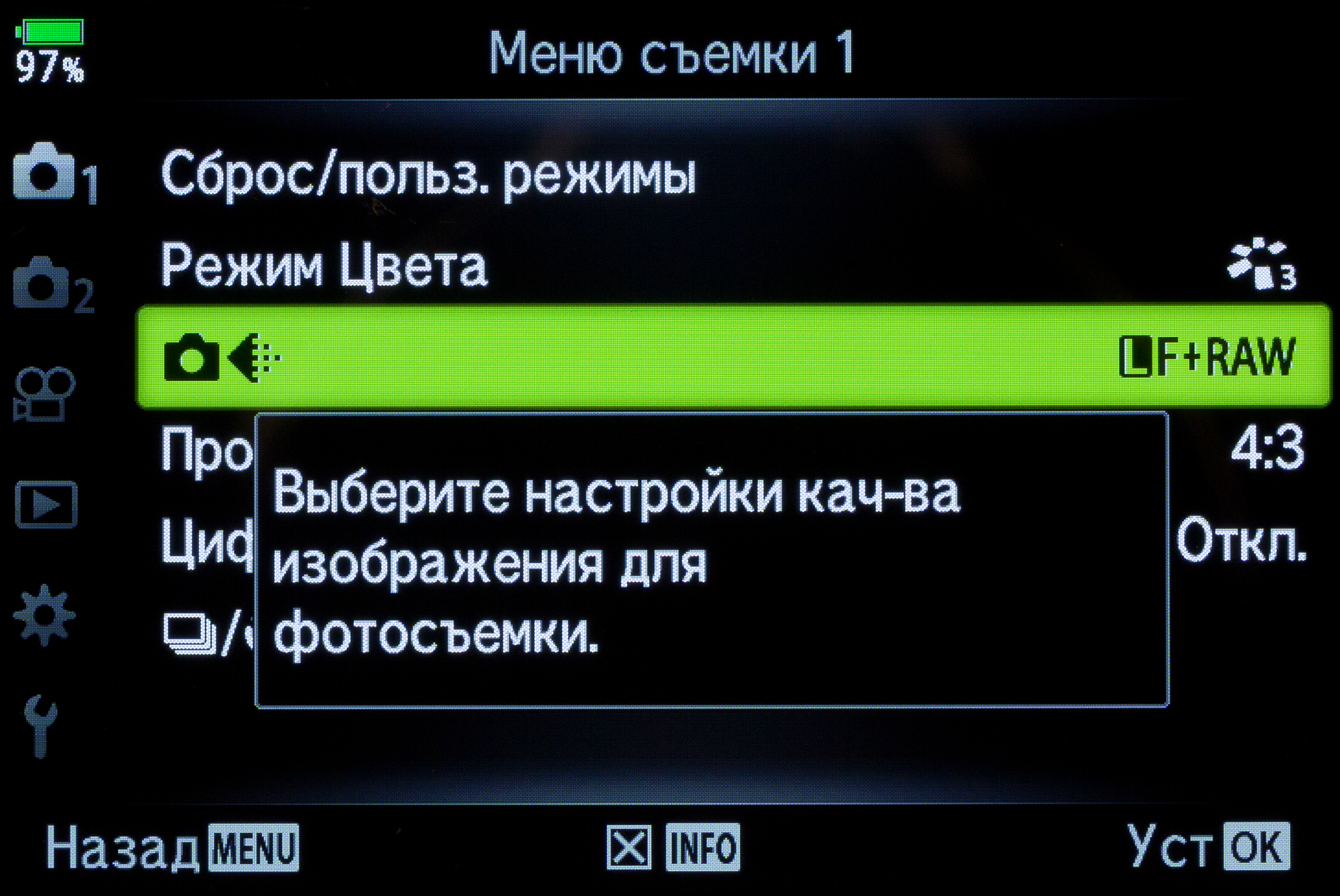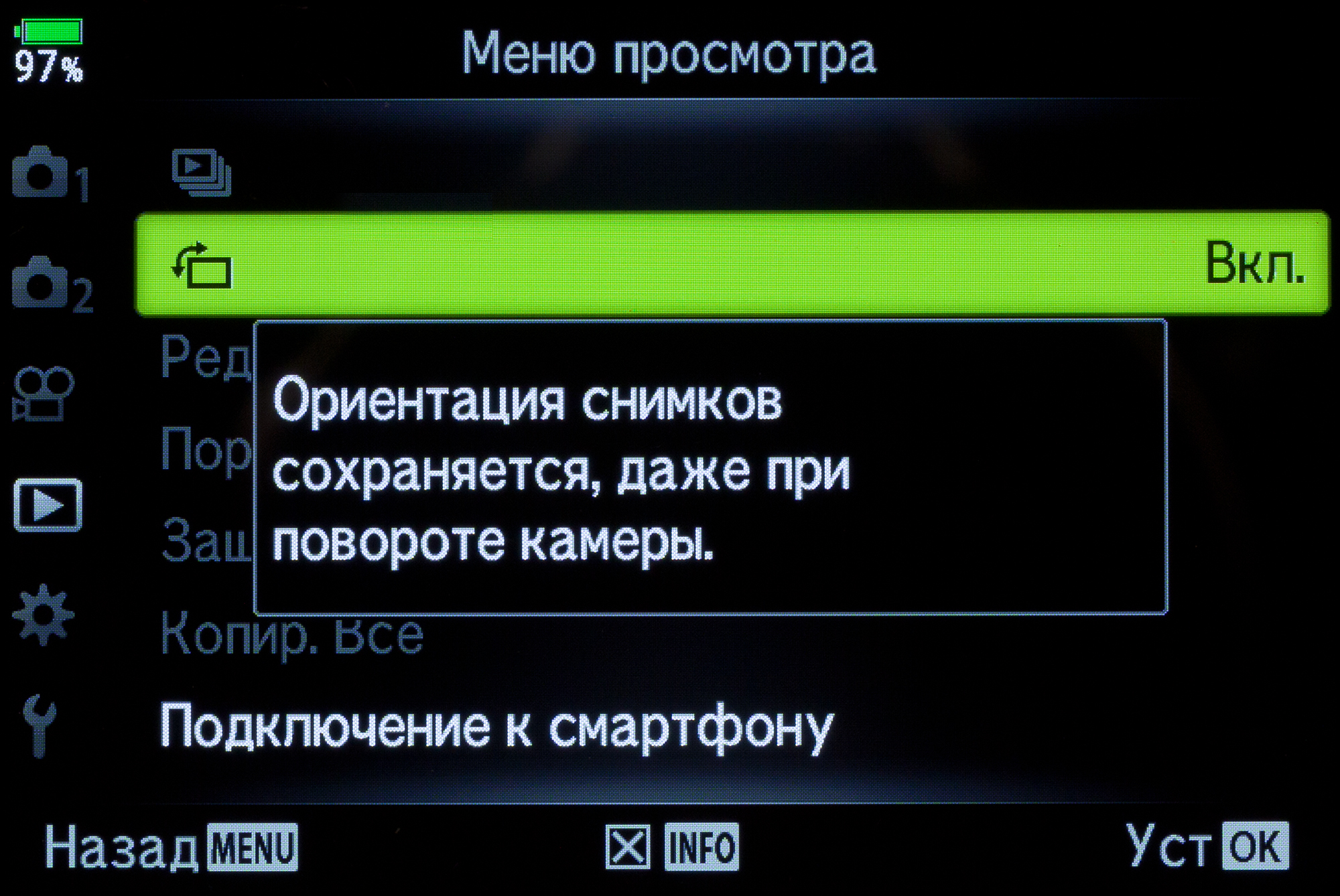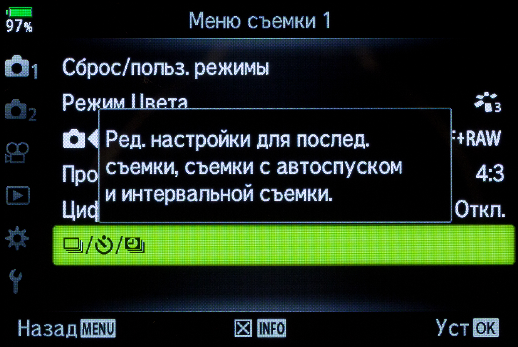 Блоки опций собраны в группы: фотосъемка 1/2, съемка видео, просмотр, пользовательское меню и настройки. Далее следует ветвление меню до второго, а иногда — третьего, четвертого (и далее) порядков вложения. Каждый пункт снабжен разъяснением-подсказкой. Мы не станем подробно описывать устройство и работу с меню, так как это выходит за рамки нашего материала и, кроме того, весьма подробно описано в руководстве пользователя (его можно скачать с официального сайта производителя). Приведем лишь наиболее важные скриншоты.