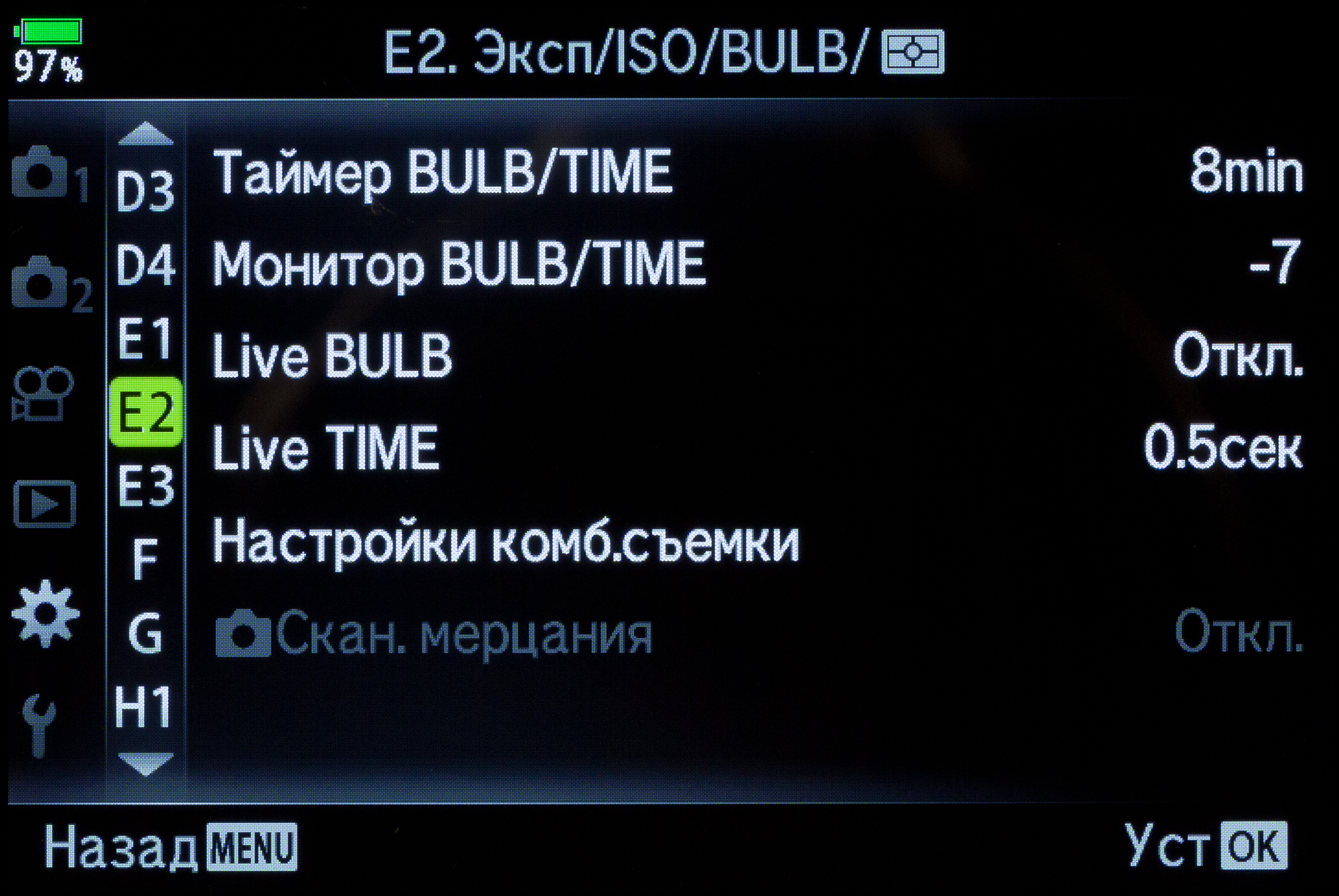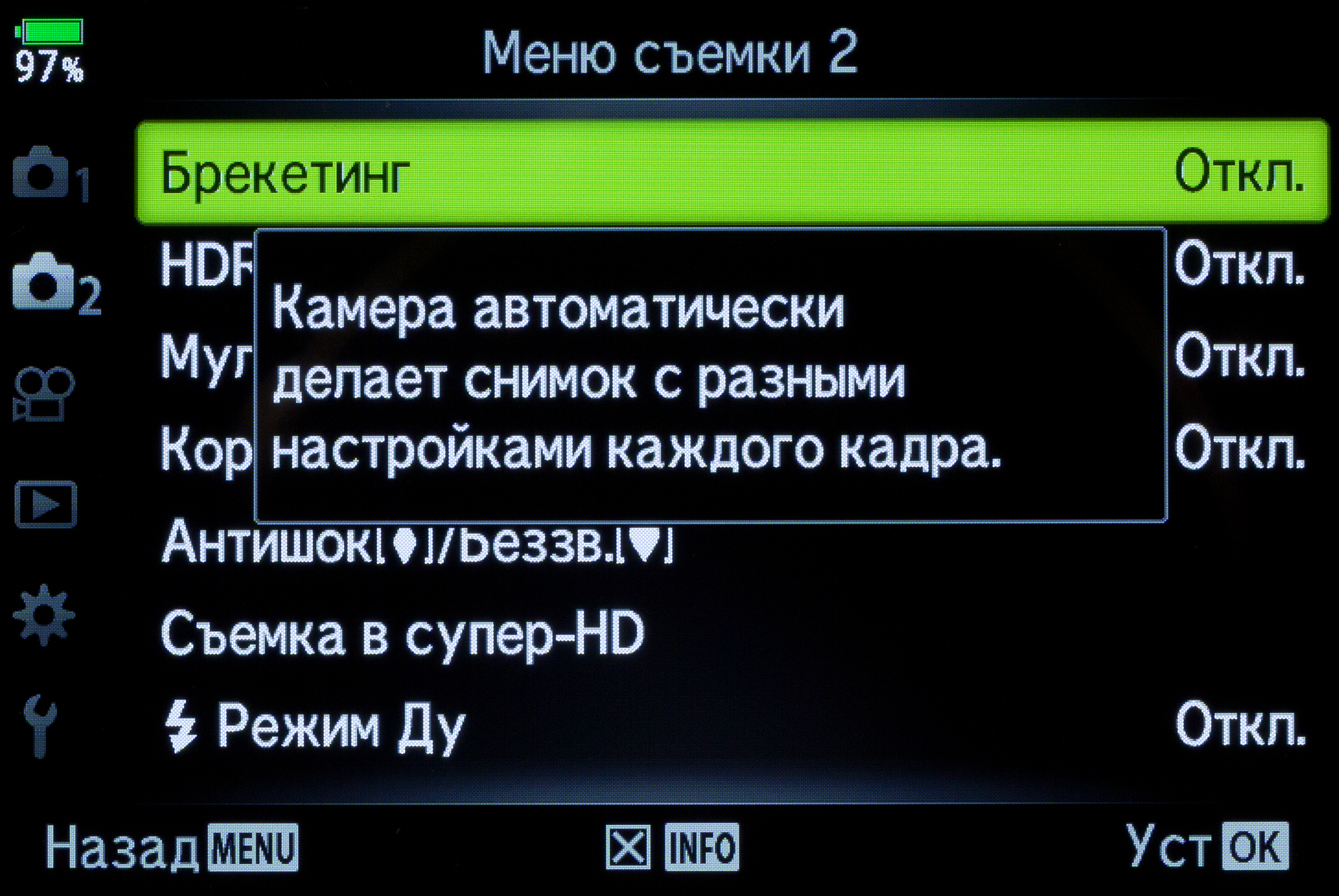 | Экспобрэкетинг | ±5 (2, 3, 5, 7 кадров) с шагом ⅓, ⅔, 1 EV | ±5 (2, 3, 5, 7 кадров) с шагом ⅓, ⅔, 1 EV | ±3 (3, 5, 7 кадров) с шагом ⅓, ⅔, 1 EV | ±3 (3, 5, 7 кадров) с шагом ⅓, ⅔, 1 EV |