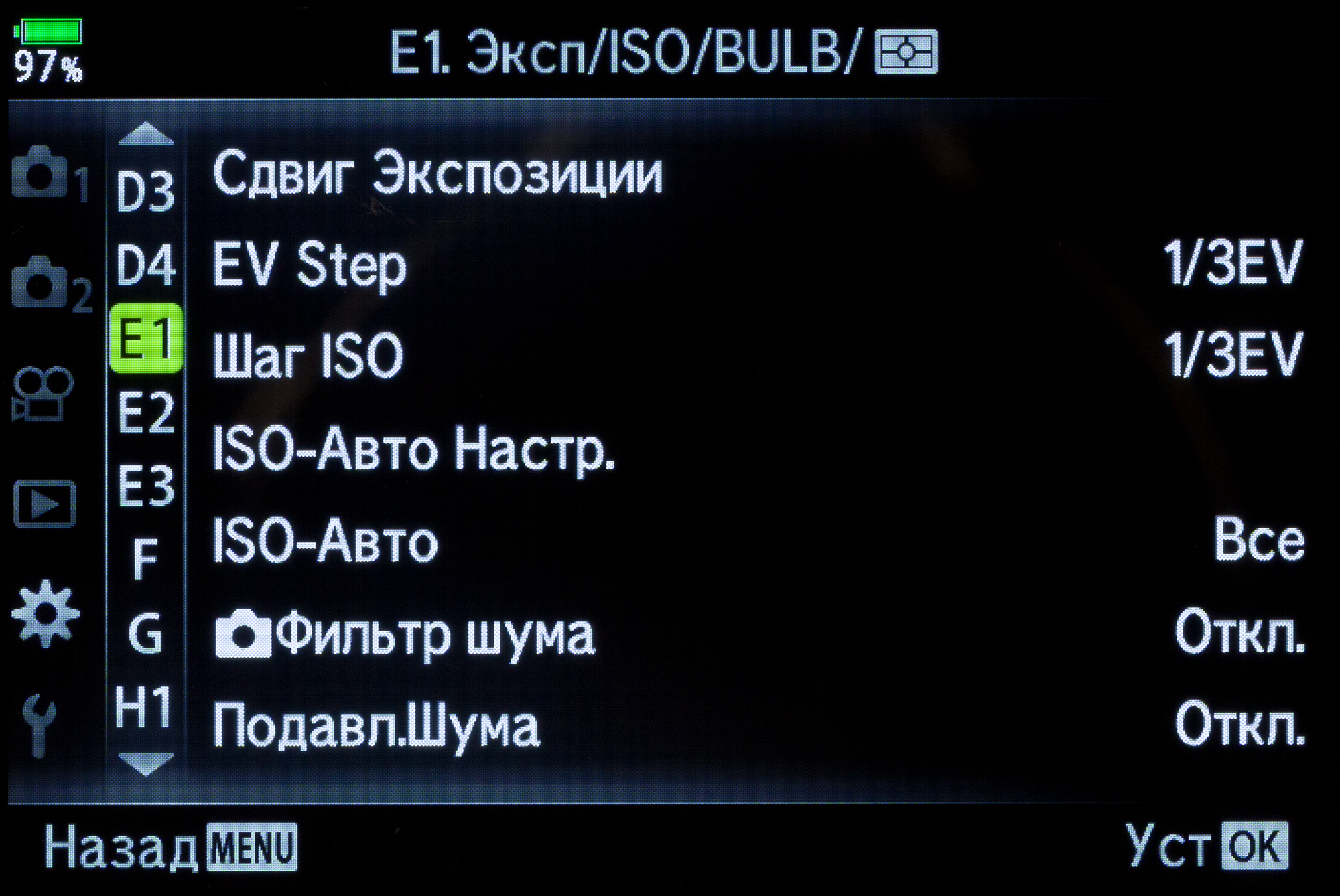 | Эквивалентная светочувствительность (расширение) | ISO 200–25600 (ISO 64) | ISO 100–25600 | ISO 160–51200 (ISO 80–204800) | ISO 200–25600 (ISO 100–25600) |
