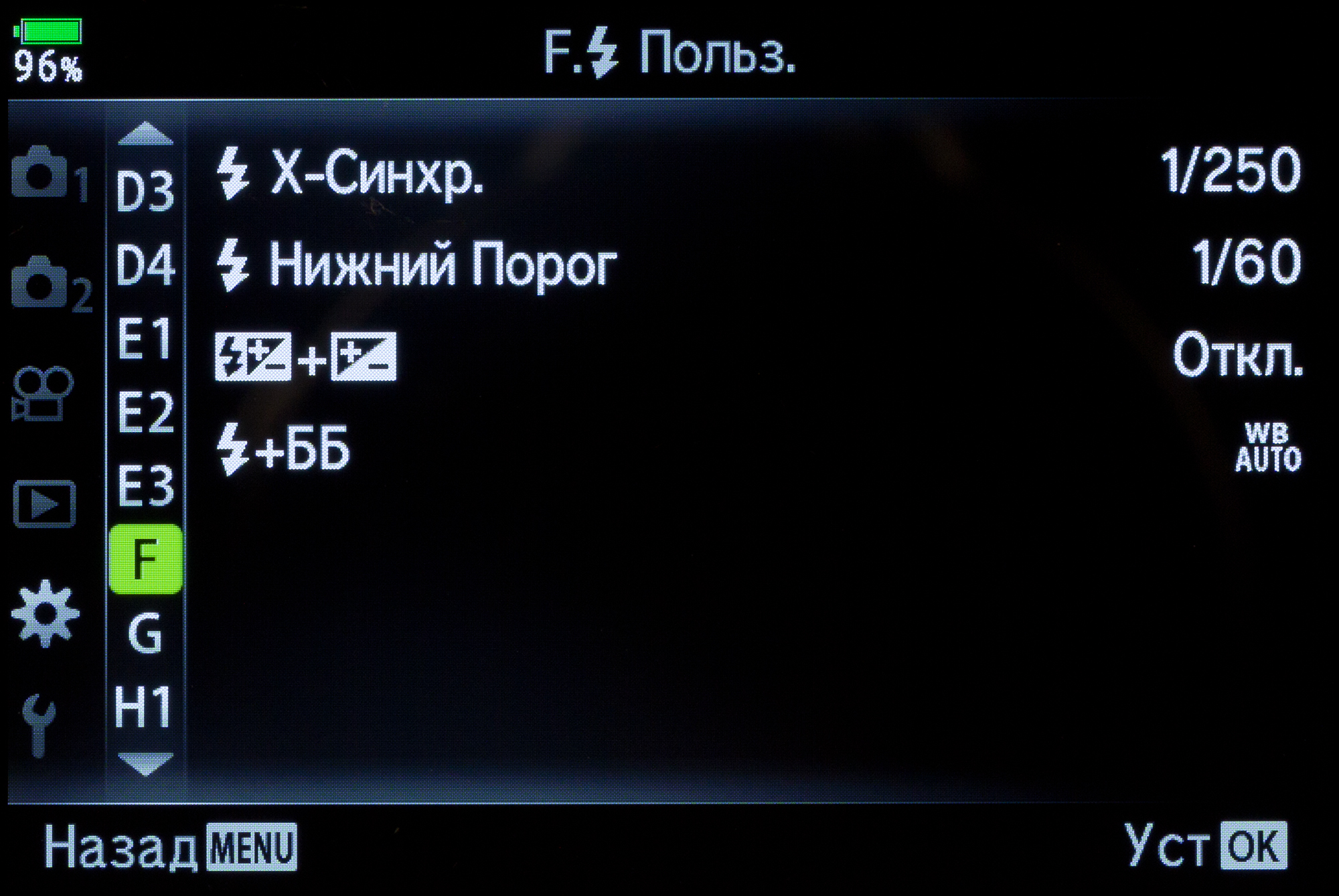 | Выдержка X-синхронизации | 1/250 с и 1/8000 с (Super FP) |