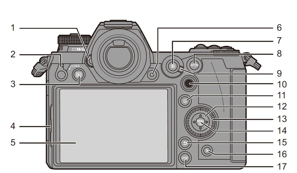 1 — колесико диоптрийной регулировки окуляра видоискателя; 2 — рычажок блокировки органов управления; 3 — кнопка просмотра отснятого материала; 4 — замок дисплея; 5 — сенсорный дисплей; 6 — кнопка активации съемки видео; 7 — кнопка выбора зоны АФ; 8 — кнопка активации принудительной АФ; 9 — рычажок выбора режимов АФ; 10 — джойстик; 11 — кнопка вызова «быстрого меню» [Q]; 12 — пятипозиционный переключатель; 13 — вертикальный диск управления; 14 — кнопка вызова меню и подтверждения выбора его опций; 15 — кнопка возврата и отмены; 16 — кнопка удаления отснятого материала; 17 — кнопка изменения отображаемых параметров на дисплее.