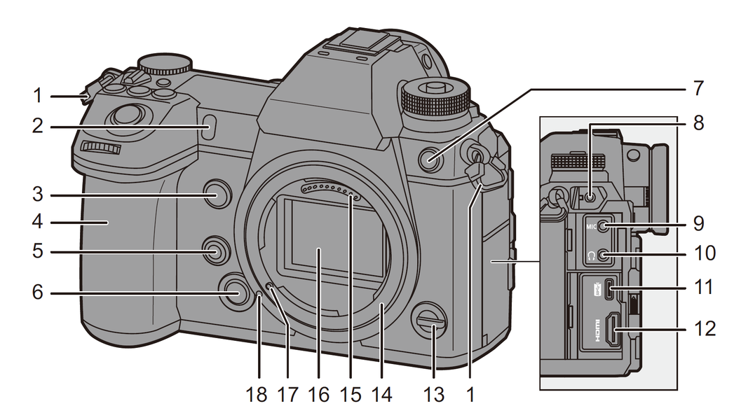 1 — петля шейного ремня; 2 — прожектор АФ и индикатор автоспуска; 3 — кнопка Fn1; 4 — ручка для удержания камеры правой рукой; 5 — кнопка Fn2 (по умолчанию — предварительный просмотр сцены); 6 — кнопка разблокировки байонетного крепления объектива; 7 — коаксиальный разъем синхронизации с импульсными источниками освещения; 8 — разъем проводного пульта ДУ; 9 — вход внешнего микрофона; 10 — аудиовыход на наушники; 11 — разъем USB Type C; 12 — видеовыход HDMI; 13 — рычажок Fn; 14 — фланец байонетного крепления объектива; 15 — контактная группа объектива; 16 — сенсор изображения; 17 — стопорный штифт объектива; 18 — метка для позиционирования объектива при установке в байонете.