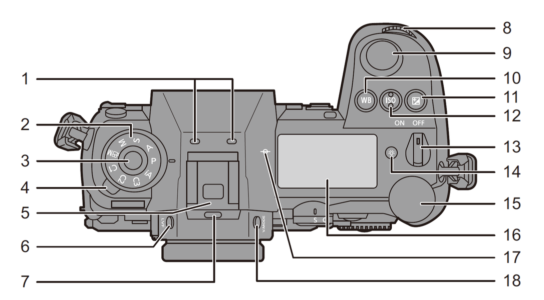 1 — отверстия микрофонов для записи звука при съемке видео; 2 — колесо главного селектора режимов съемки; 3 — кнопка блокировки колеса главного селектора; 4 — рычаг селектора режимов «протяжки»; 5 — полнофункциональный «горячий башмак»; 6 — кнопка переключения вывода изображения на дисплей и в видоискатель [LVF]; 7 — внешний громкоговоритель; 8 — передний диск установки параметров; 9 — кнопка спуска затвора; 10 — кнопка активации выбора режимов баланса белого [WB]; 11 — кнопка установки экспокомпенсации; 12 — кнопка установки эквивалентной светочувствительности [ISO]; 13 — рычажок выключателя питания камеры; 14 — кнопка активации подсветки дополнительного информационного дисплея; 15 — задний диск установки параметров; 16 — дополнительный информационный дисплей; 17 — метка отсчета расстояния от плоскости сенсора изображения; 18 — кнопка увеличения масштаба изображения [V.Mode].