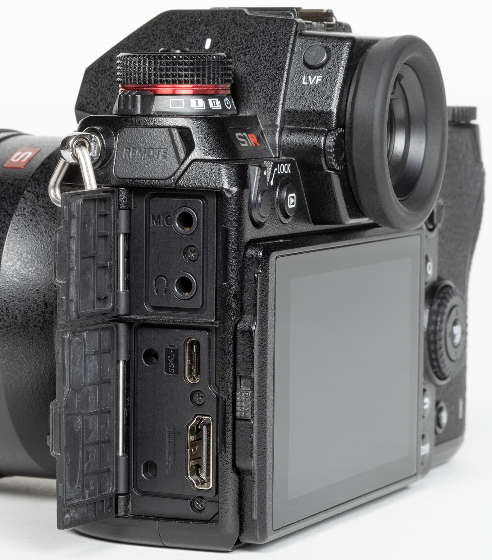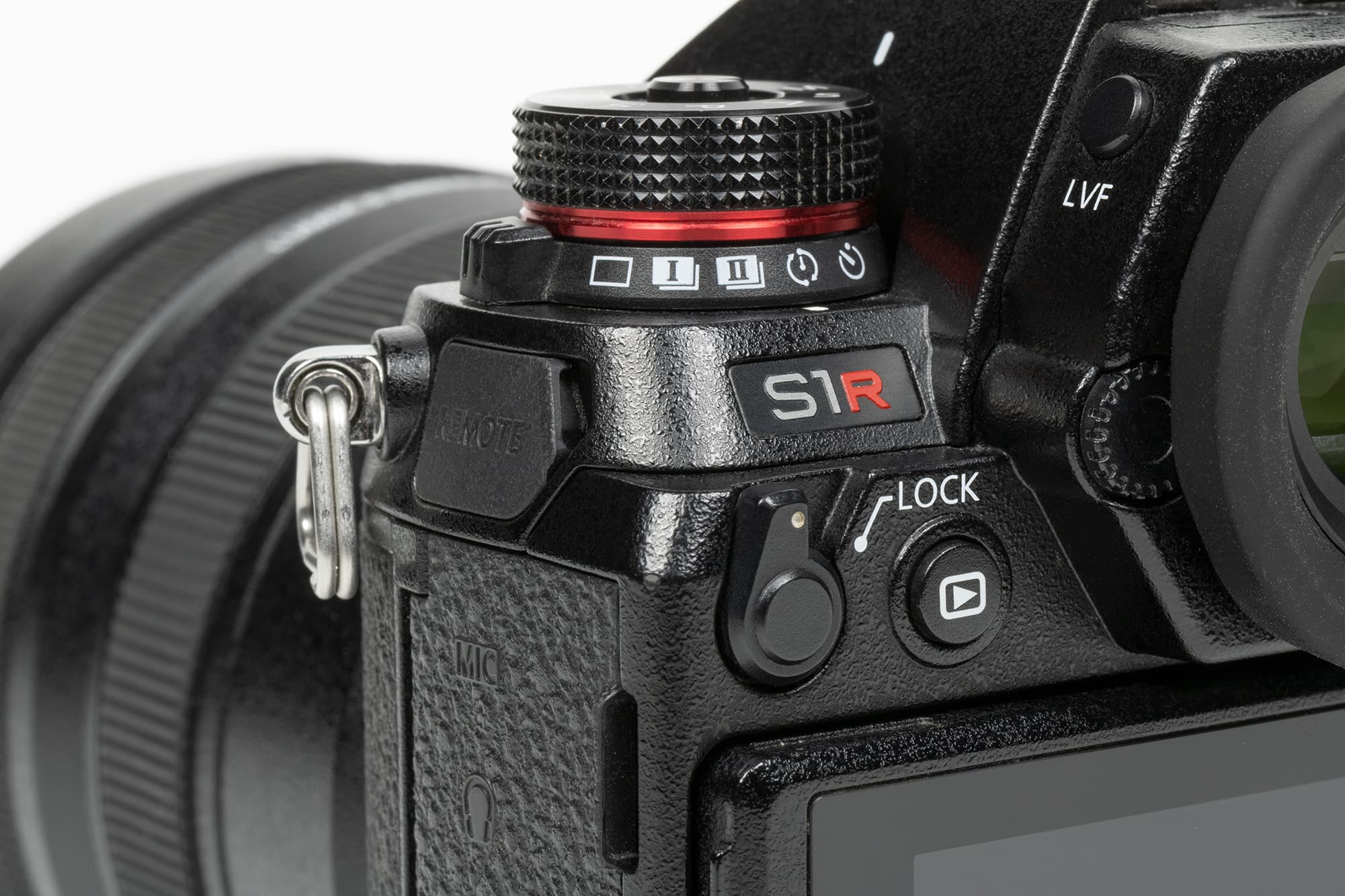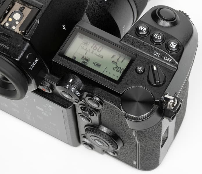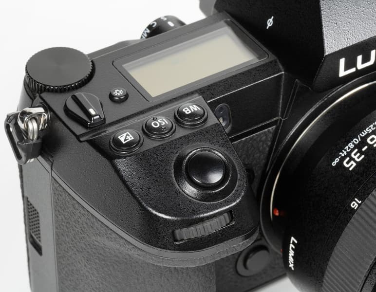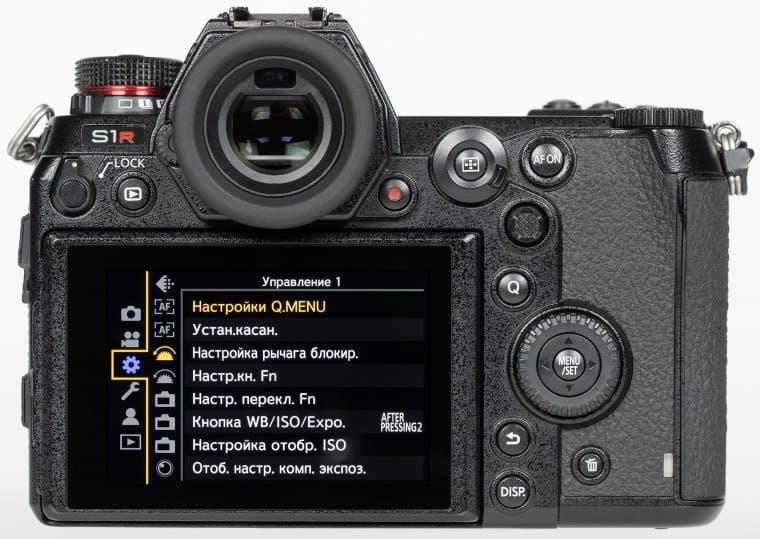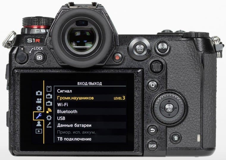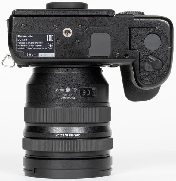 Компоновка Panasonic Lumix DC-S1R вполне традиционная, даже классическая, хорошо знакомая по другим беззеркальным аппаратам. Усеченная пирамида на месте пентапризмы зеркальных камер скрывает электронный видоискатель и окулярную оптику. Профилированная ручка для удержания камеры правой рукой имеет на своем навершии утопленный передний диск установки параметров и кнопку спуска затвора.