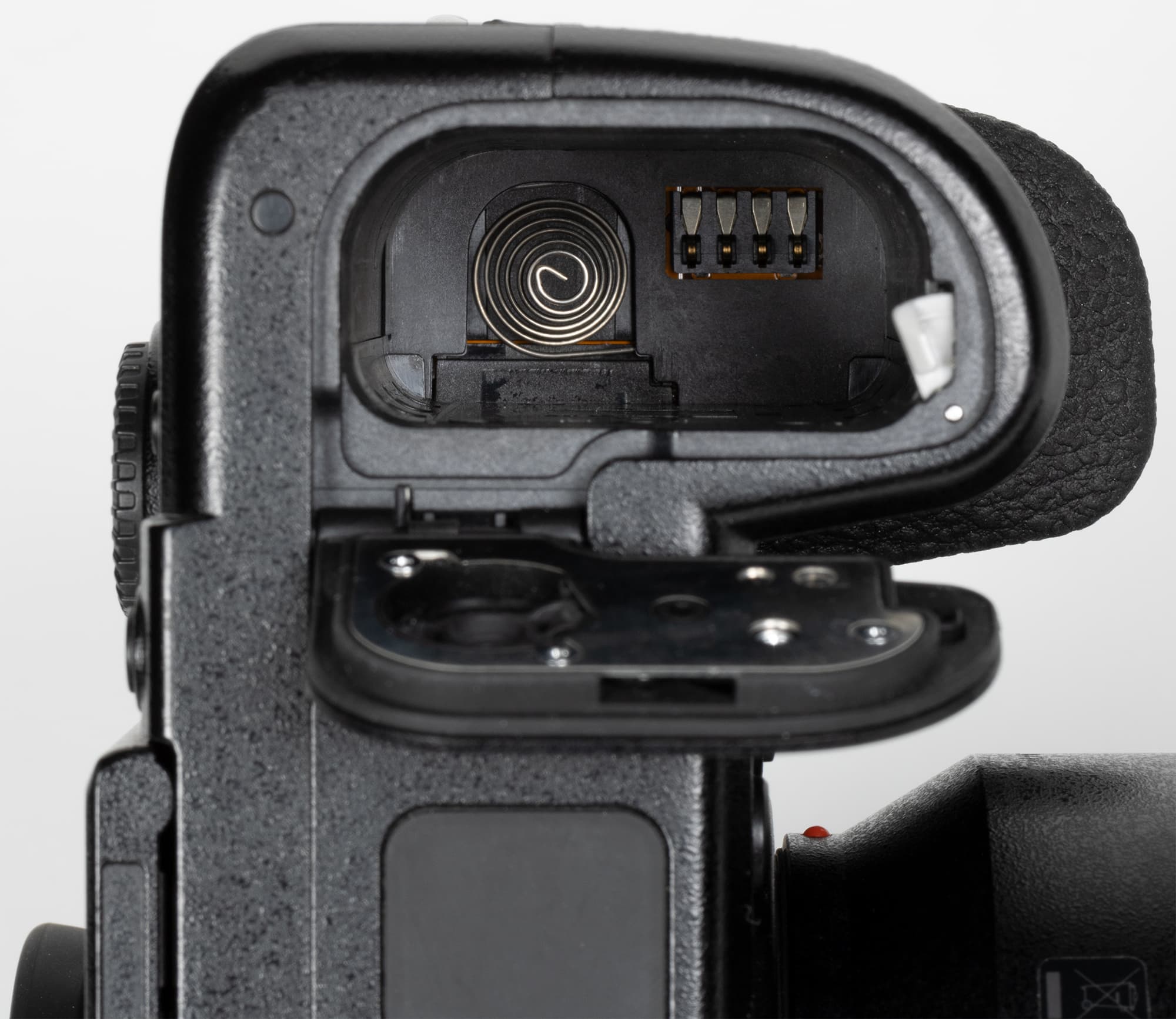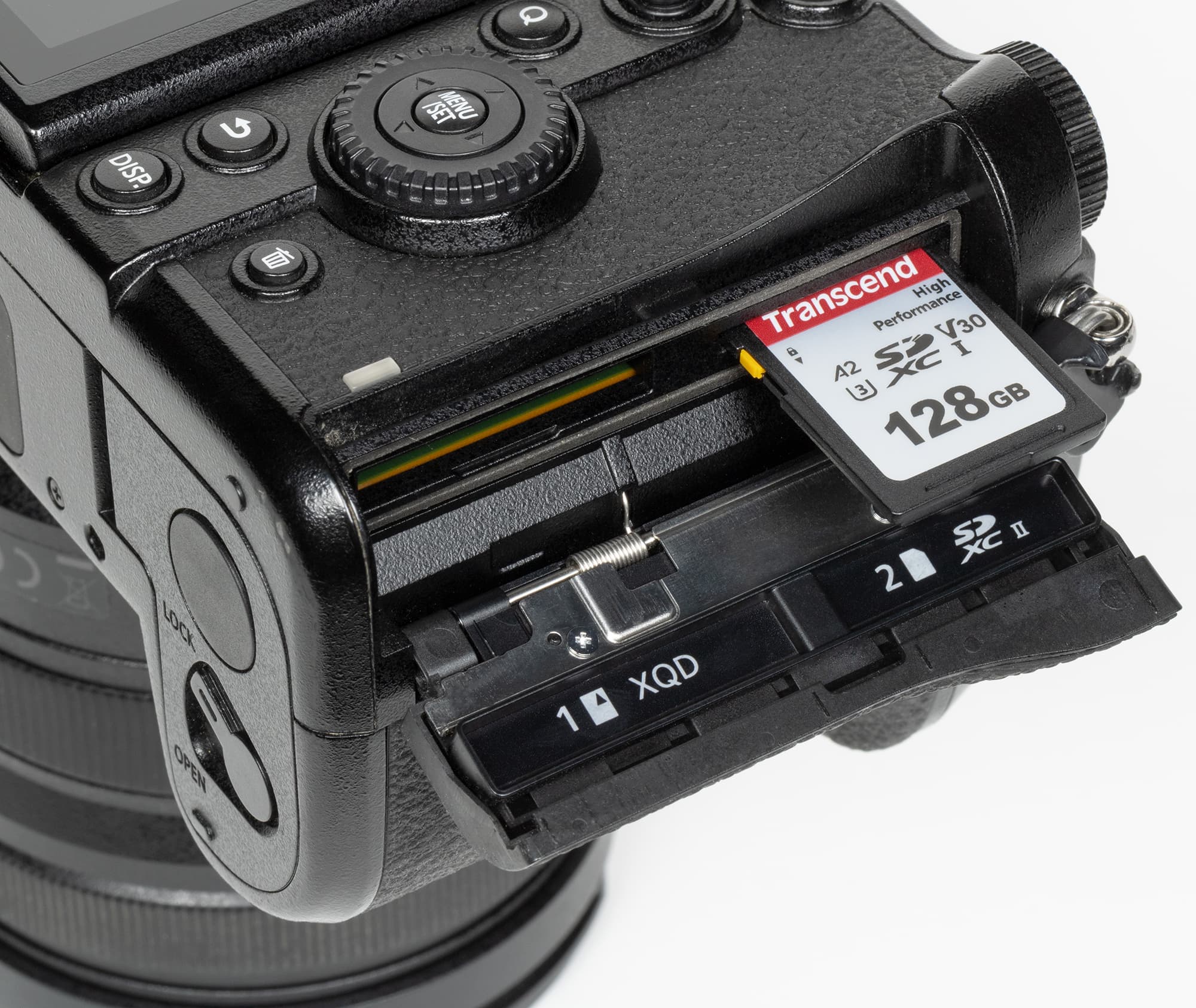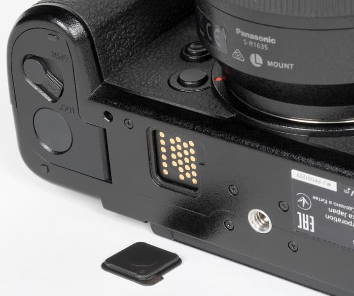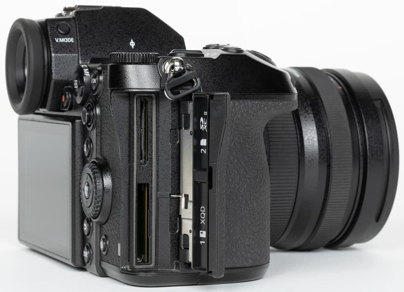 Внутри ручки (справа) под крышкой расположены два слота для карт памяти. Первый из них предназначен для носителей XQD или CFexpress, второй — для SDXC высокоскоростного стандарта UHS-II. Единственный недостаток такого решения — невозможность «зеркальной» записи на обе карты одновременно (из-за разных скоростных показателей).