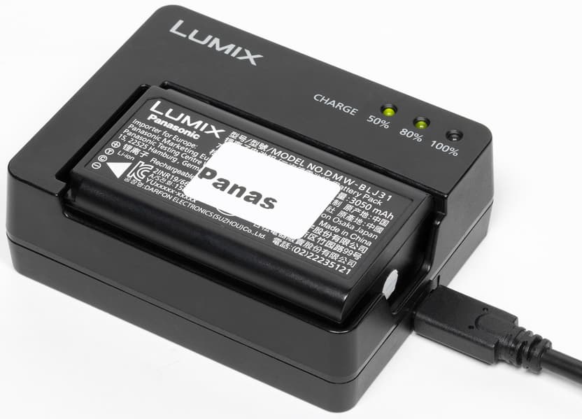 Зарядка аккумулятора производится при помощи фирменного зарядного устройства DMW-BTC14 и фирменного же адаптера сетевого питания DVLV1001Y (оба входят в комплект поставки). Согласно производителю, полностью разряженная батарея требует около 130 минут для восполнения заряда до 100%. Адаптер можно использовать для зарядки батареи внутри камеры и для питания последней.