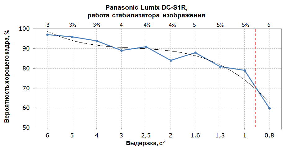 Производитель указывает эффективность стабилизатора в 6 ступеней экспозиции. Наша методика позволяет оценить эффективность стабилизатора в 5,5 ступеней с выходом годных кадров на уровне 70%, что почти соответствует заявленным возможностям.
