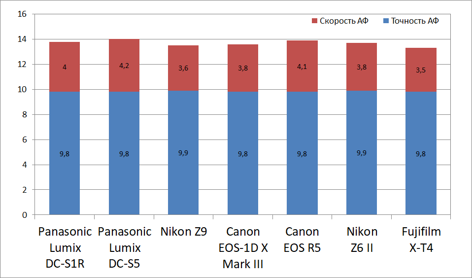 Panasonic Lumix DС-S1R в нашем рейтинге занимает далеко не первое место и уступает по скорости текущему лидеру наших стендовых испытаний Panasonic Lumix DC-S5. Впрочем, по точности АФ наша героиня весьма примечательна, что уже давно стало нормой для топовых камер.