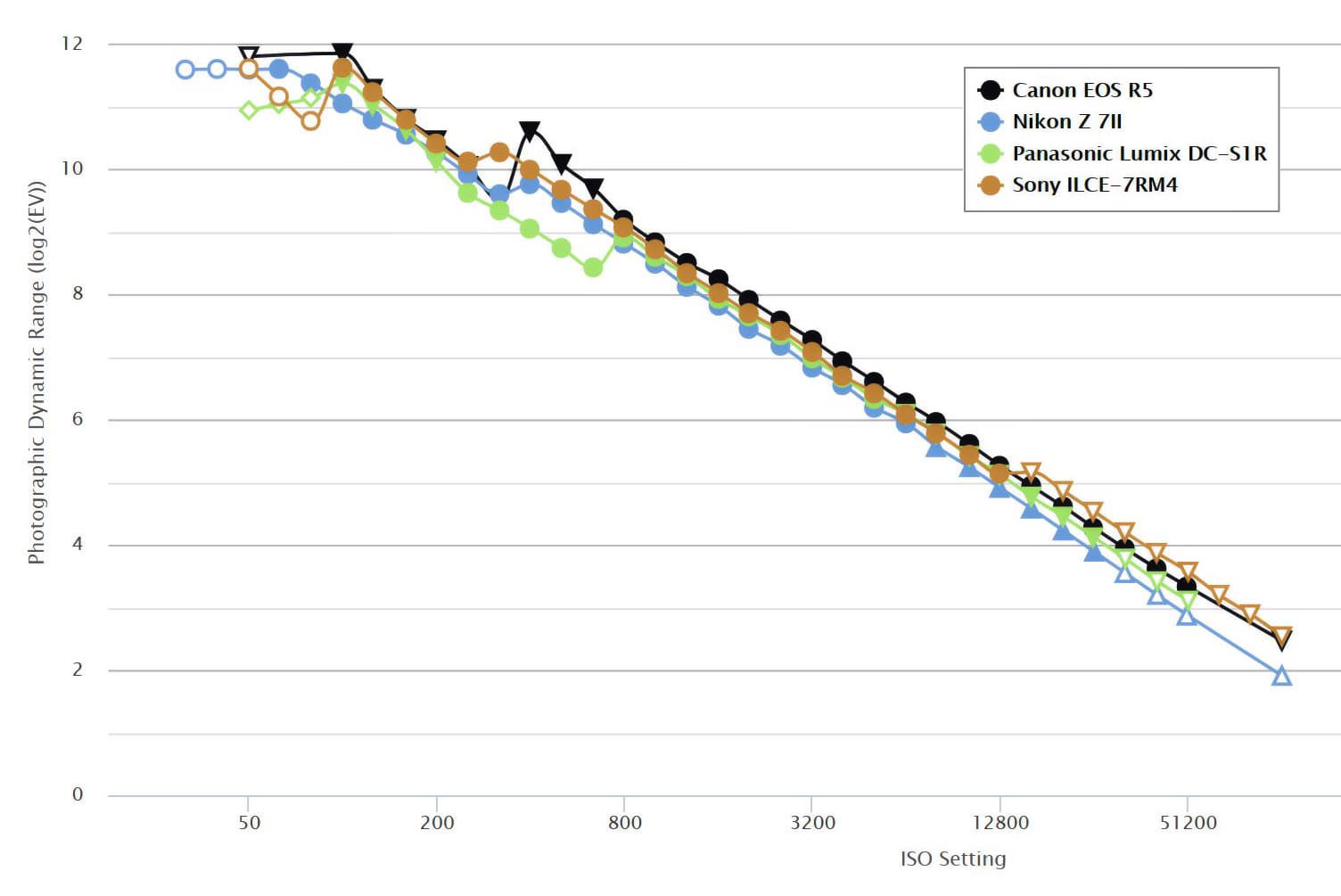 Sony ICLE-7RM4 превосходит соперниц в трех номинациях: наибольшее разрешение сенсора (61 Мп), минимальные размеры и вес, а также максимальная автономность, то есть очень большой ресурс батареи. ДД сенсора у нее весьма широк, однако у конкурента из стана Canon диаграмма выглядит чуть лучше.
