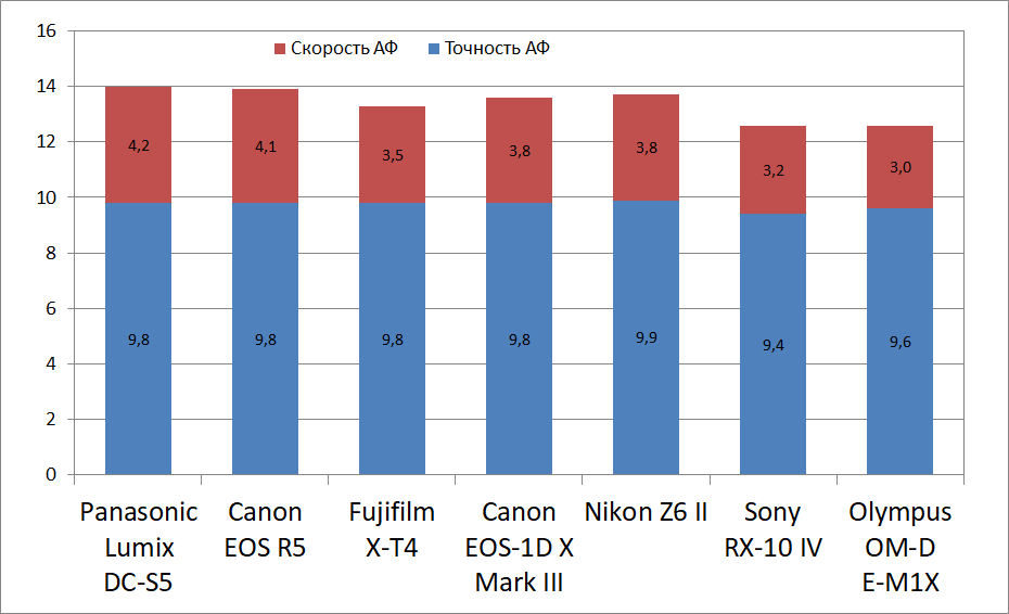 На данный момент Panasonic DC-S5 лидирует в нашем рейтинге. По точности она практически идеальна, что уже давно стало нормой для топовых моделей, а по скорости обгоняет все ранее протестированные камеры, в том числе Canon R5 и Nikon Z6 II.