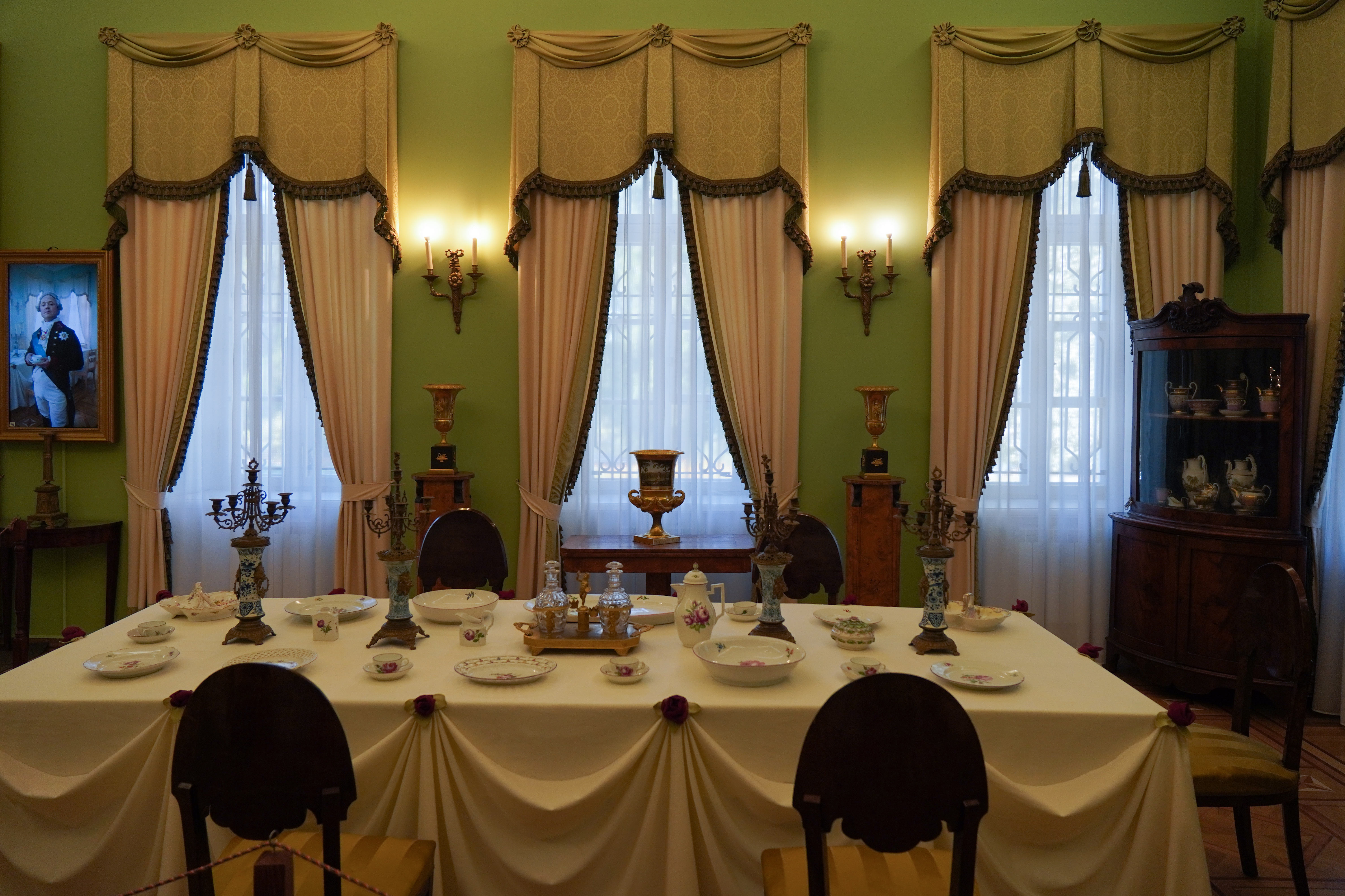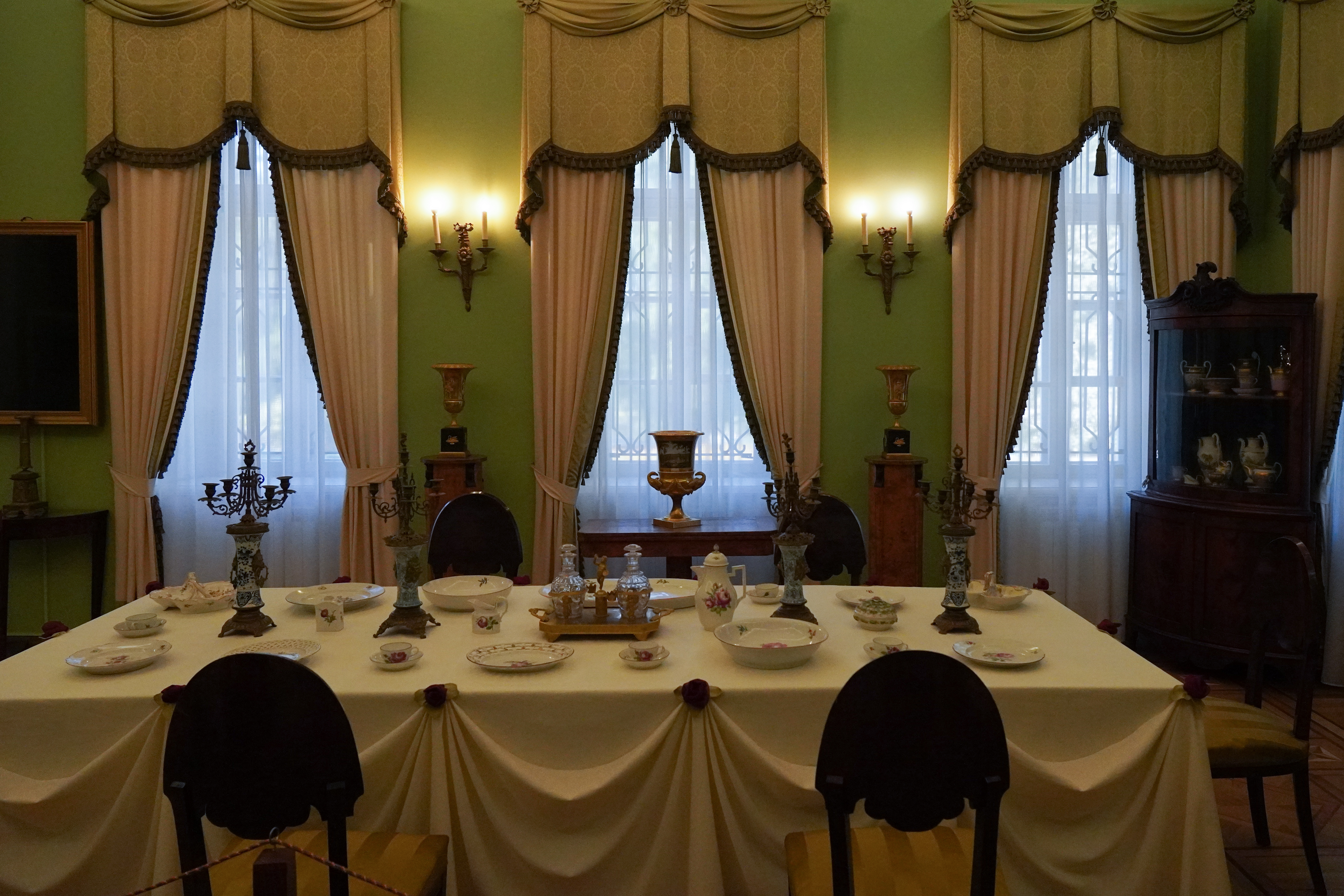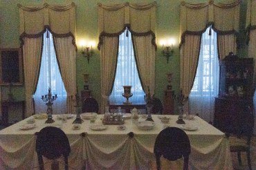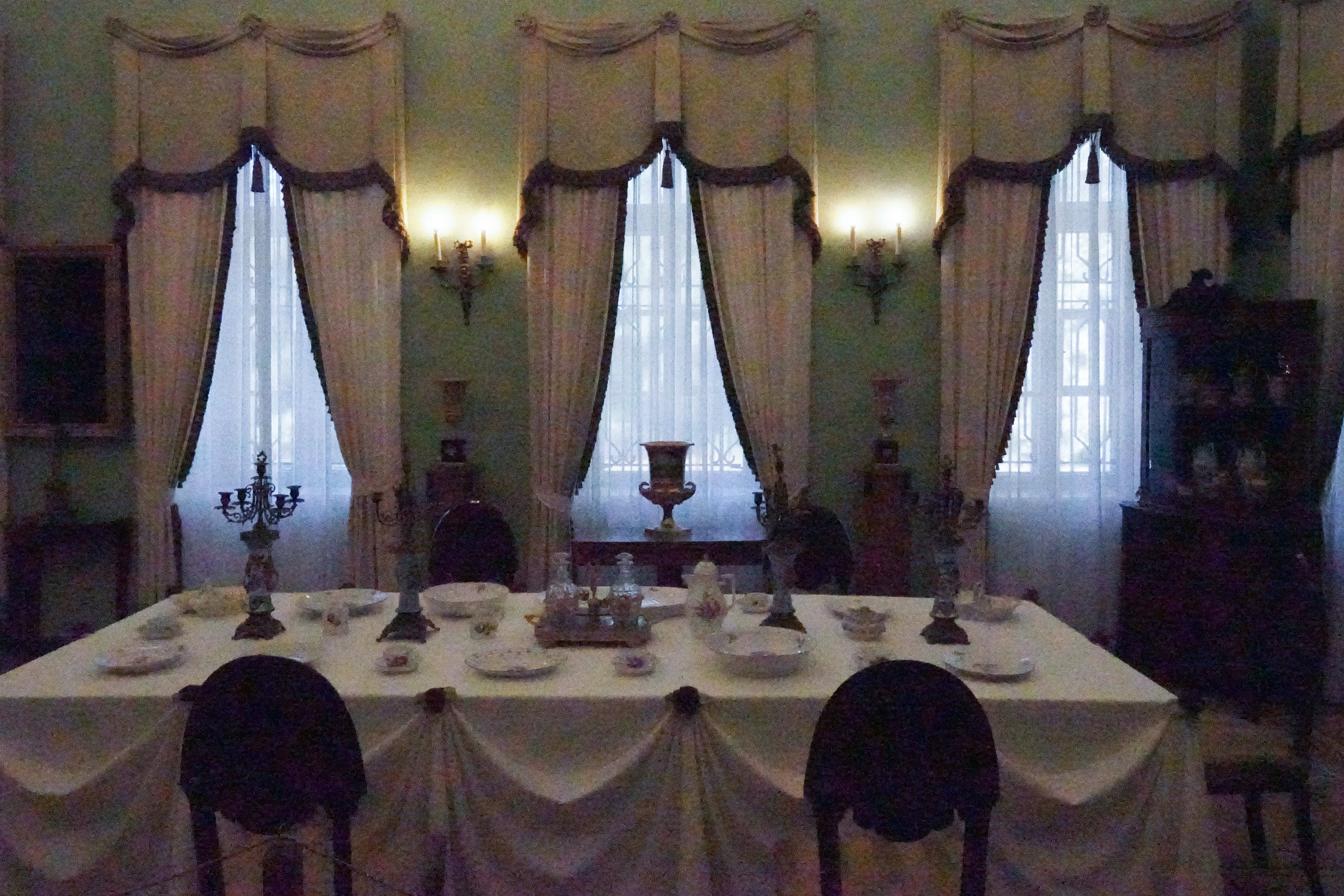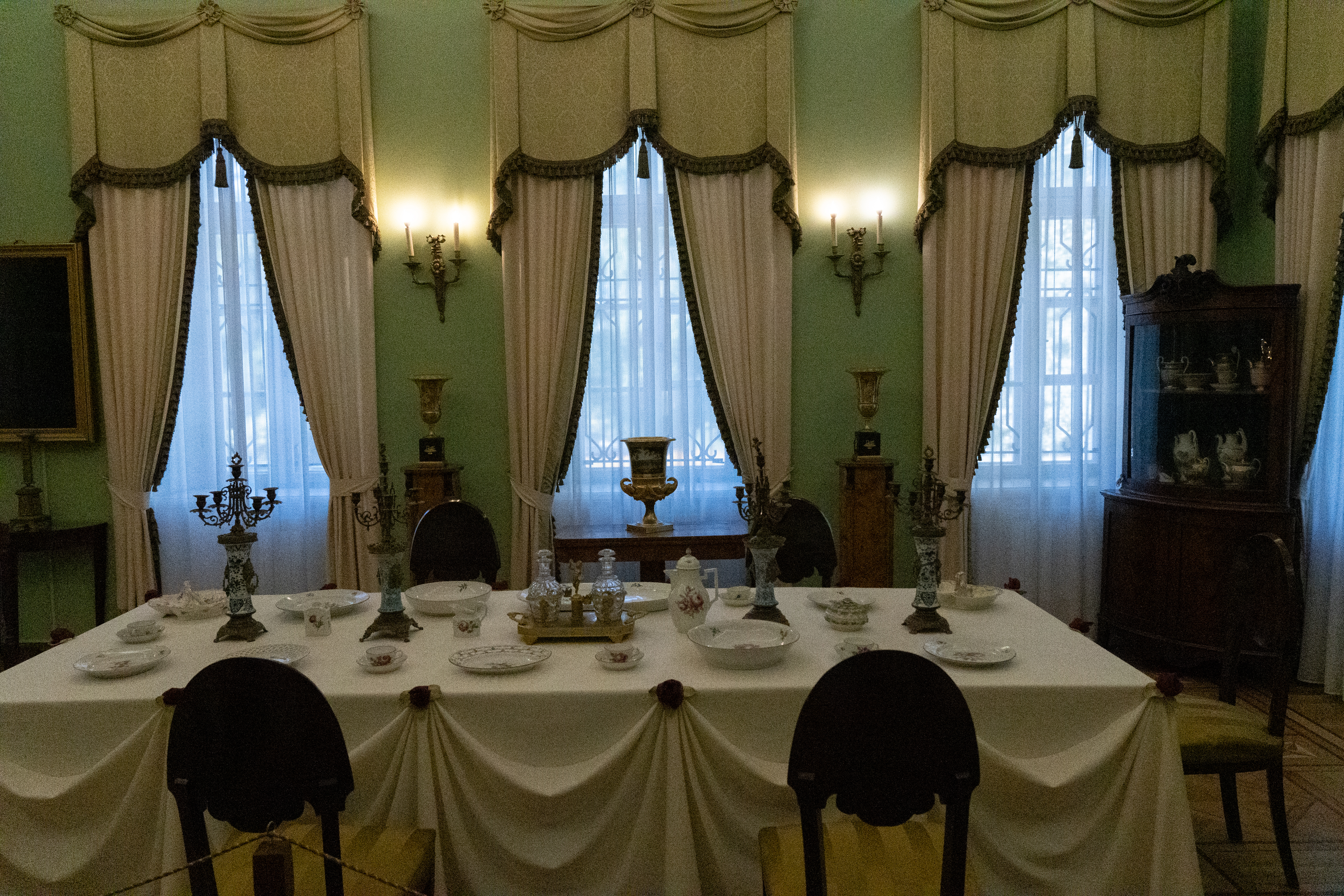 Обещанные спецификациями рабочий и расширенный диапазоны ISO весьма обнадеживают, но как подъем светочувствительности отражается на снимках в реальной жизни? Чтобы выяснить это, мы предприняли фотосъемку в столовой московского генерал-губернатора князя Дмитрия Голицына, героя Отечественной войны 1812 г. (музей-усадьба Вязёмы Одинцовского района Московской области). При фотографировании сцены в неизменных условиях смешанного освещения мы последовательно повышали ISO на одну ступень от снимка к снимку. Слева приводим JPEG из камеры без обработки, справа — RAW, преобразованные в JPEG средствами Adobe Camera RAW последней доступной версии без какого бы то ни было ручного вмешательства (мы не корректировали даже АББ).
